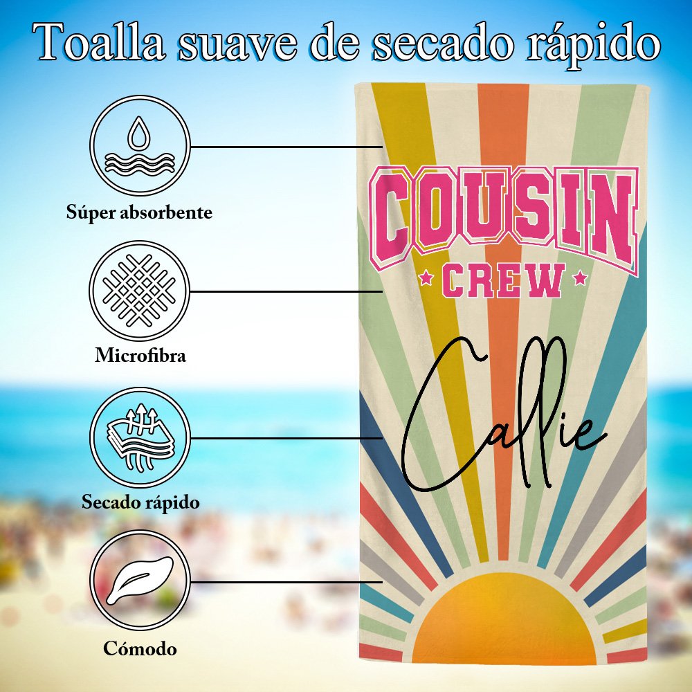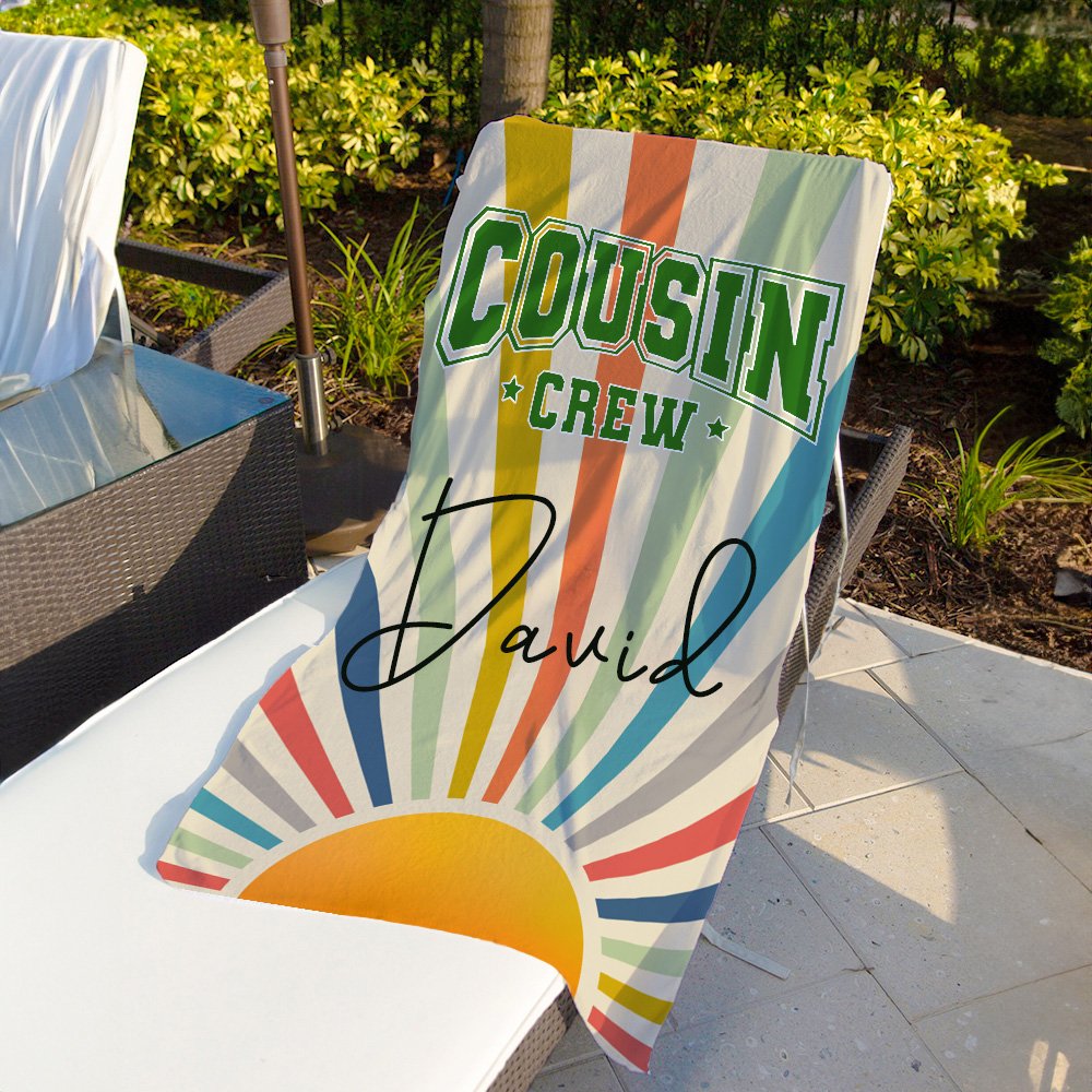 Utilizando un estilo retro con rayos de sol y colores vibrantes, el texto “Cousin Crew” se presenta en 16 tonos brillantes, clásicos y elegantes. Además, permite personalizar con nombres. Convierte la toalla de playa en un identificador exclusivo—perfecta para salidas familiares o reuniones de primos, destacándose con un diseño único que refleja la personalidad y los lazos familiares.