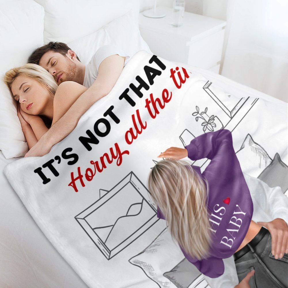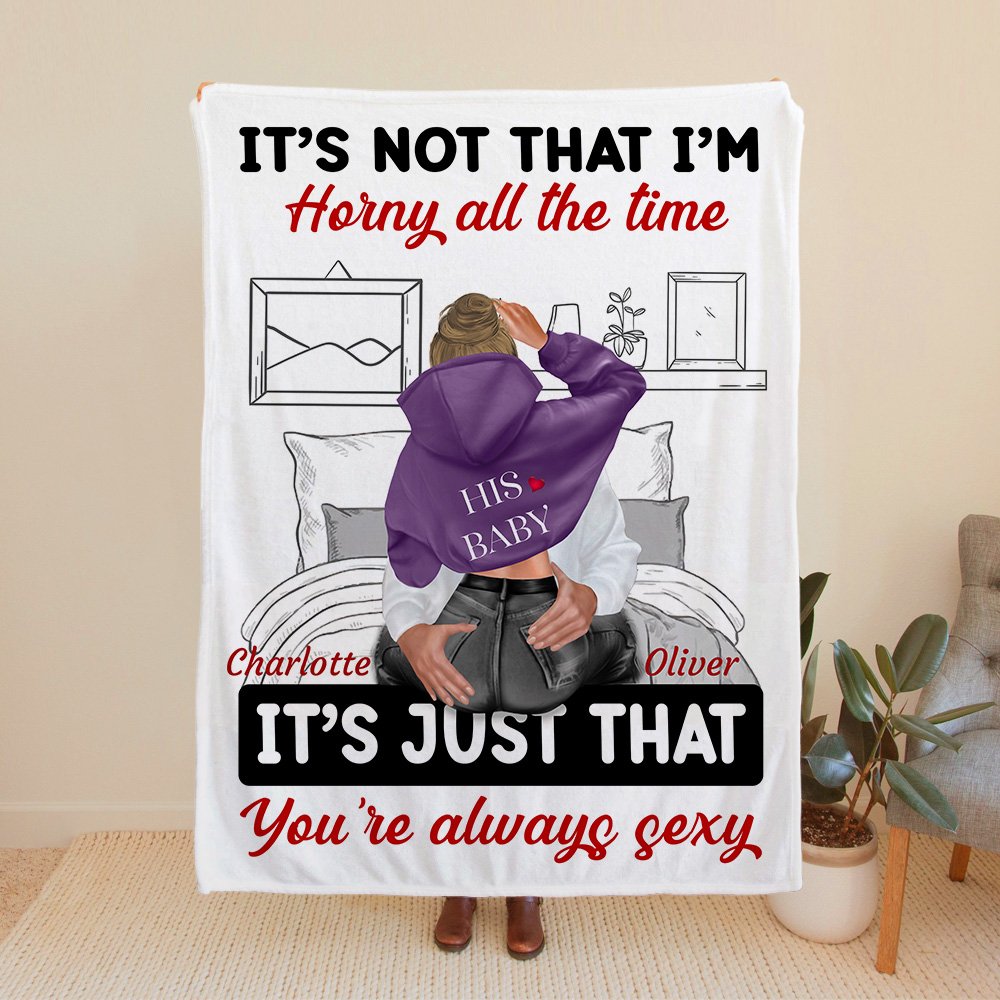 Nuestra manta presenta a una pareja abrazada como elemento de diseño, con un acogedor dormitorio como fondo y el texto "No es que esté cachondo todo el tiempo, es que tú siempre eres sexy" para darle al diseño general un matiz más emocional. La manta en sí simboliza el calor, mientras que el diseño del amante le da un significado más apasionado y romántico, haciendo de esta manta una verdadera necesidad para las parejas.