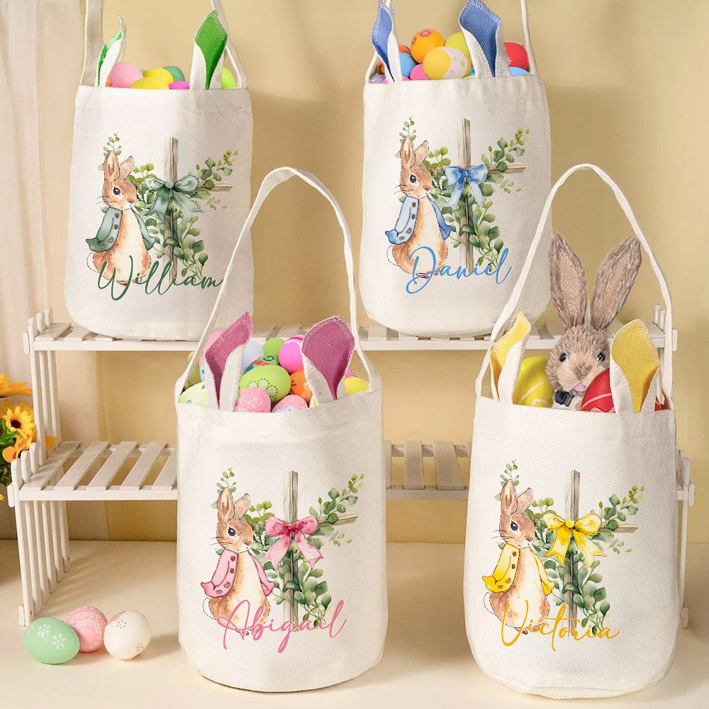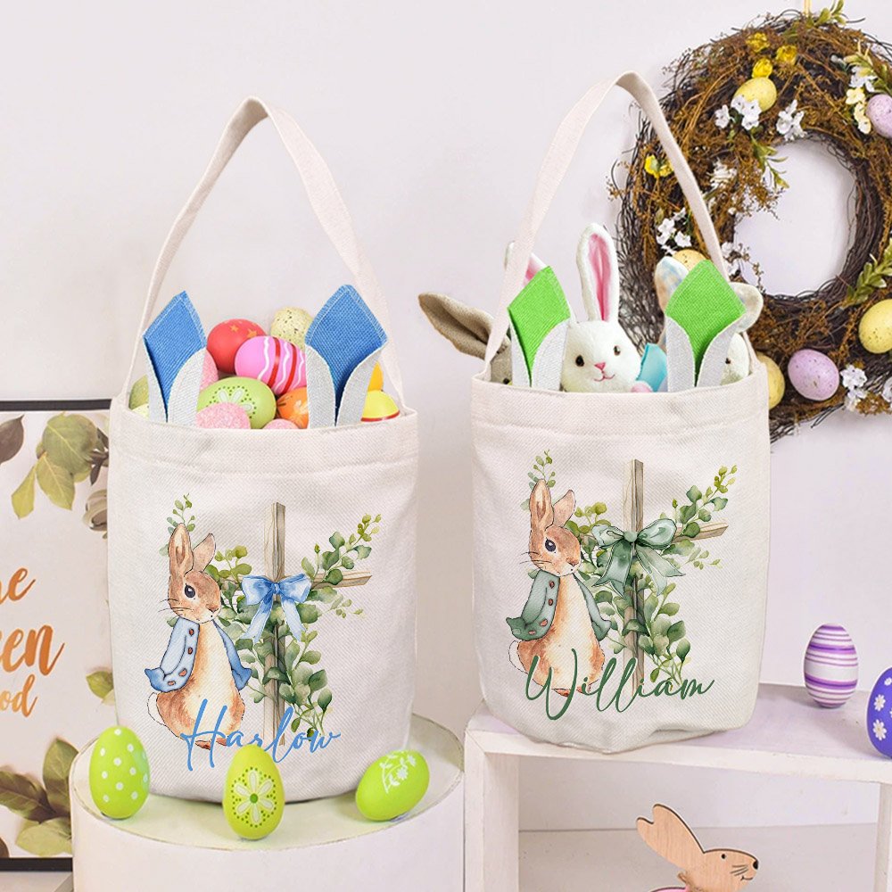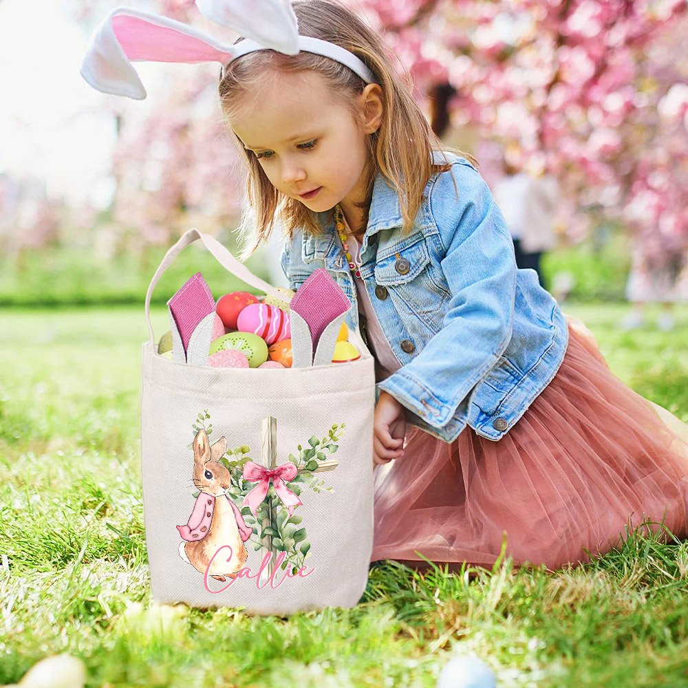 Esta encantadora cesta de Pascua presenta un diseño personalizable de un conejito y una cruz, junto con el nombre de su hijo, lo que la convierte en un complemento único y festivo para cualquier celebración. Su aspecto juguetón aumenta la alegría de la búsqueda de huevos de Pascua.