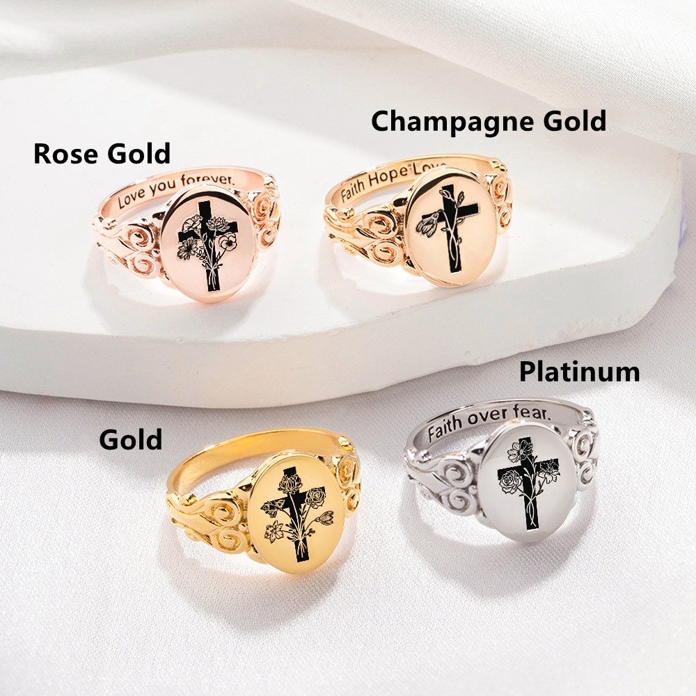 Elaborado con meticulosa atención al detalle, este anillo muestra una exquisita artesanía. Está hecho de latón o plata de ley de alta calidad, lo que garantiza su durabilidad y un tacto lujoso. El intrincado diseño de la cruz y el delicado ramo de flores de nacimiento están hábilmente grabados, dando como resultado una impresionante pieza de joyería que es testimonio de dedicación y arte.