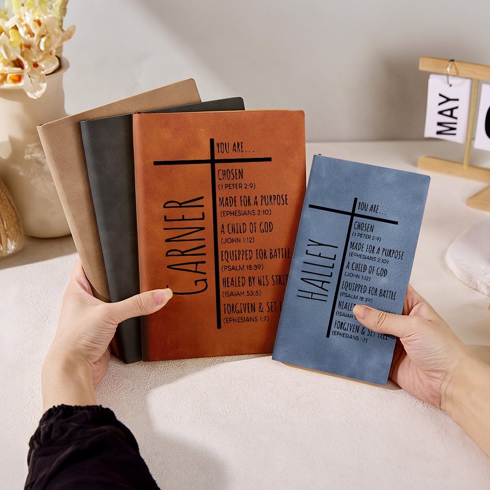 Este cuaderno de piel presenta un sencillo diseño de portada con un nombre personalizable, lleno de personalidad y significado espiritual. Cada frase, como "Tú eres el elegido", y los proverbios de la Biblia nos dan aliento a diario. Su diseño único combina fe, personalización y belleza natural.