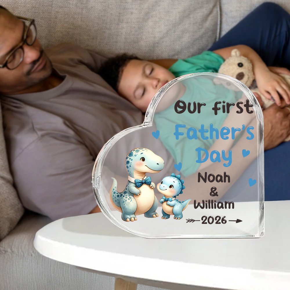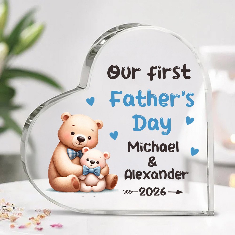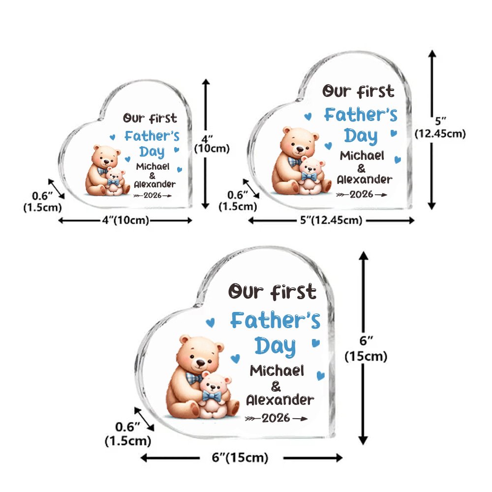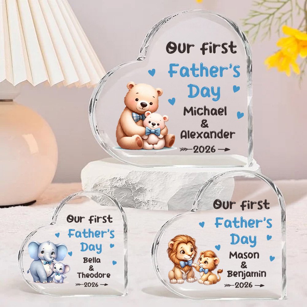 Esta placa acrílica presenta un estampado de simpáticos animales padre-hijo abrazados, como un león, un elefante y un dinosaurio. Lleva impresas las palabras "Nuestro primer Día del Padre", que simbolizan la profundidad del amor paterno y el vínculo del afecto familiar. También puedes personalizar la placa imprimiendo los nombres del bebé y del padre para hacerla aún más única.