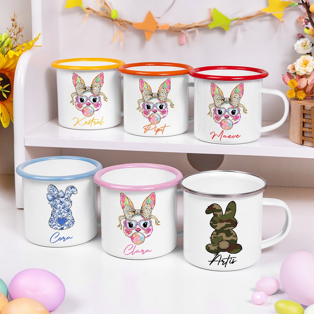 Esta increíble taza de esmalte está impresa con una variedad de simpáticas imágenes de conejitos, cada una de ellas con motivos y decoraciones únicos, como lazos brillantes, vestidos de flores azules y ropa de camuflaje, que añaden interés y atractivo visual. También puedes personalizarlo con texto. Esta pieza muestra tu personalidad y tu amor por todas las cosas de Pascua.