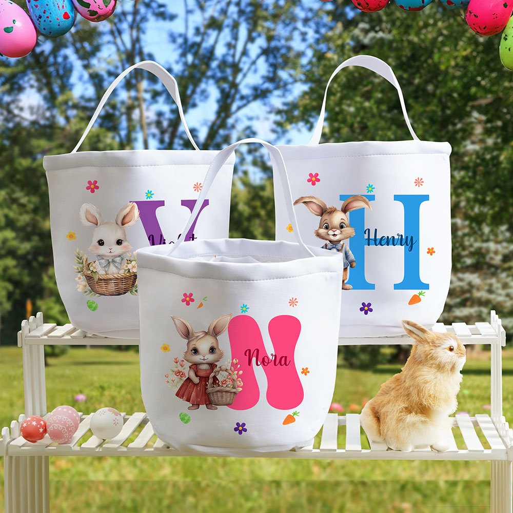 Esta encantadora cesta de Pascua incluye una inicial y un nombre personalizables, adornados con un conejito que luce una variedad de adorables atuendos. Con colores vibrantes y bonitos diseños florales y primaverales, añade un toque alegre a cualquier celebración.