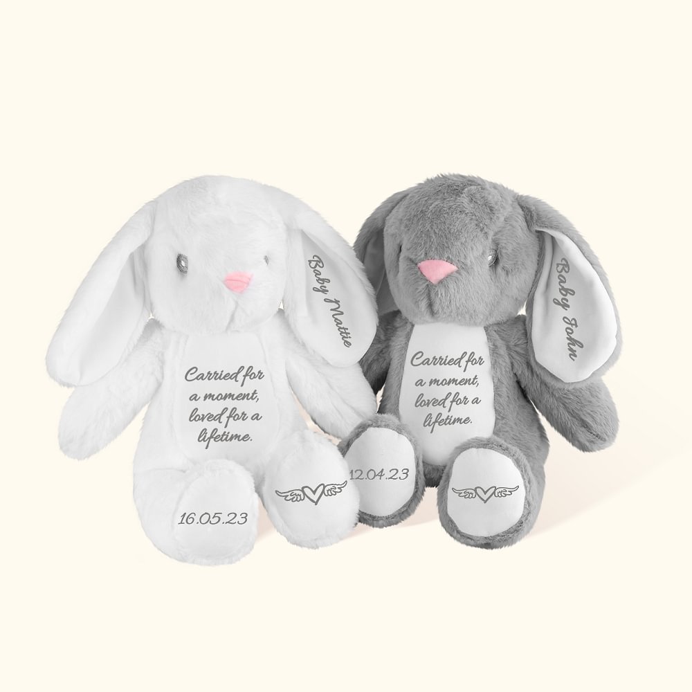 El texto "Carried for a moment, loved for a lifetime" en la barriga del conejito y el motivo de corazón alado en el pie izquierdo del conejito son fijos.