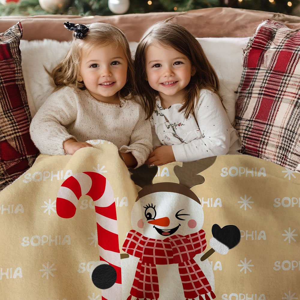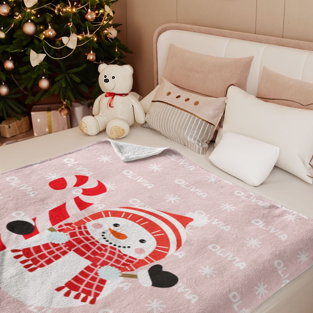 ¡Prepárate para abrazar la magia de las fiestas con nuestra suave manta! Esta adorable manta presenta un encantador diseño que captura la fantasía del invierno: un feliz muñeco de nieve con bufanda y sosteniendo una piruleta en forma de J flanqueada por festivos copos de nieve. Lo que la hace única es la opción de personalizarla con un nombre, diferentes expresiones y un tocado, añadiendo un toque distintivo que la transforma en un preciado recuerdo.