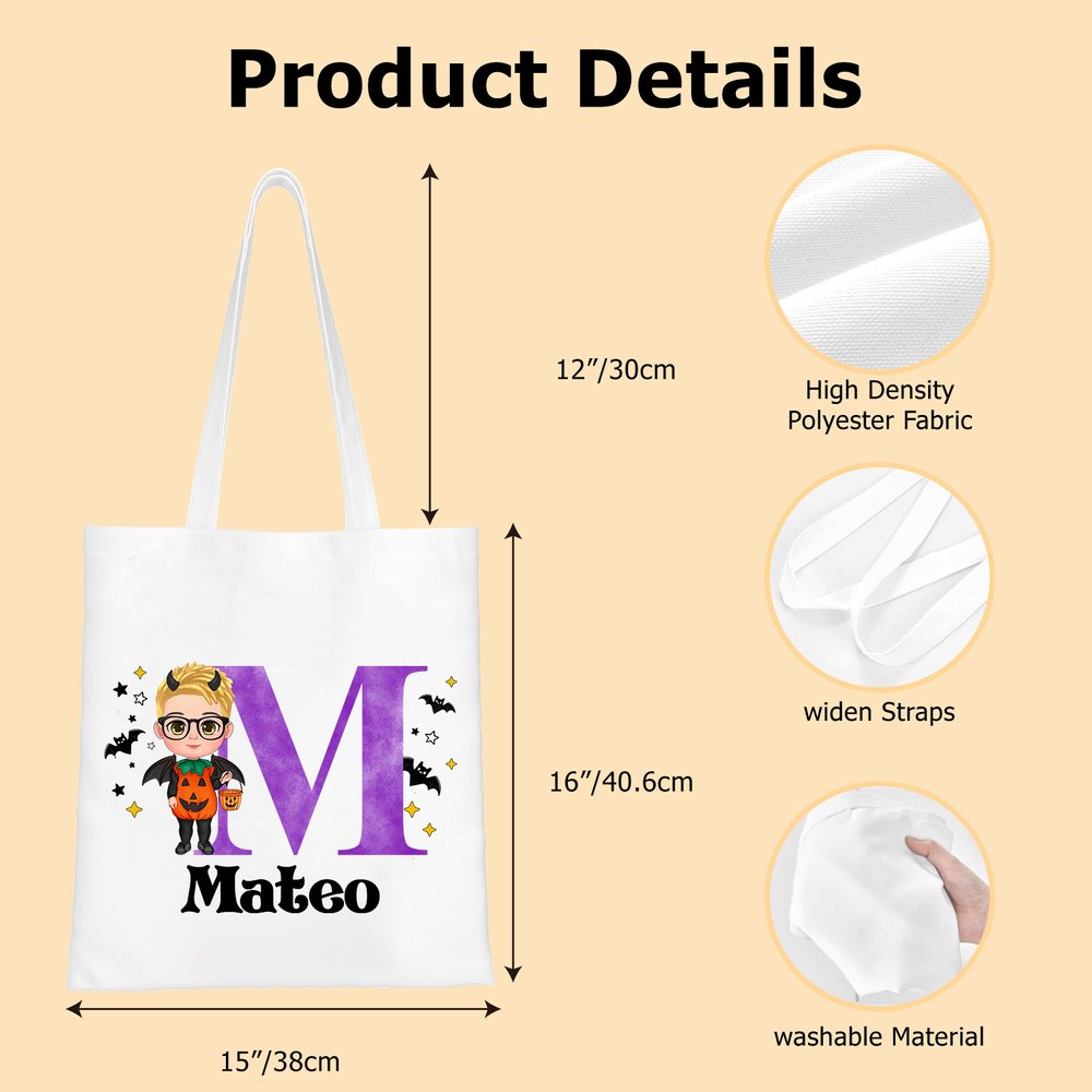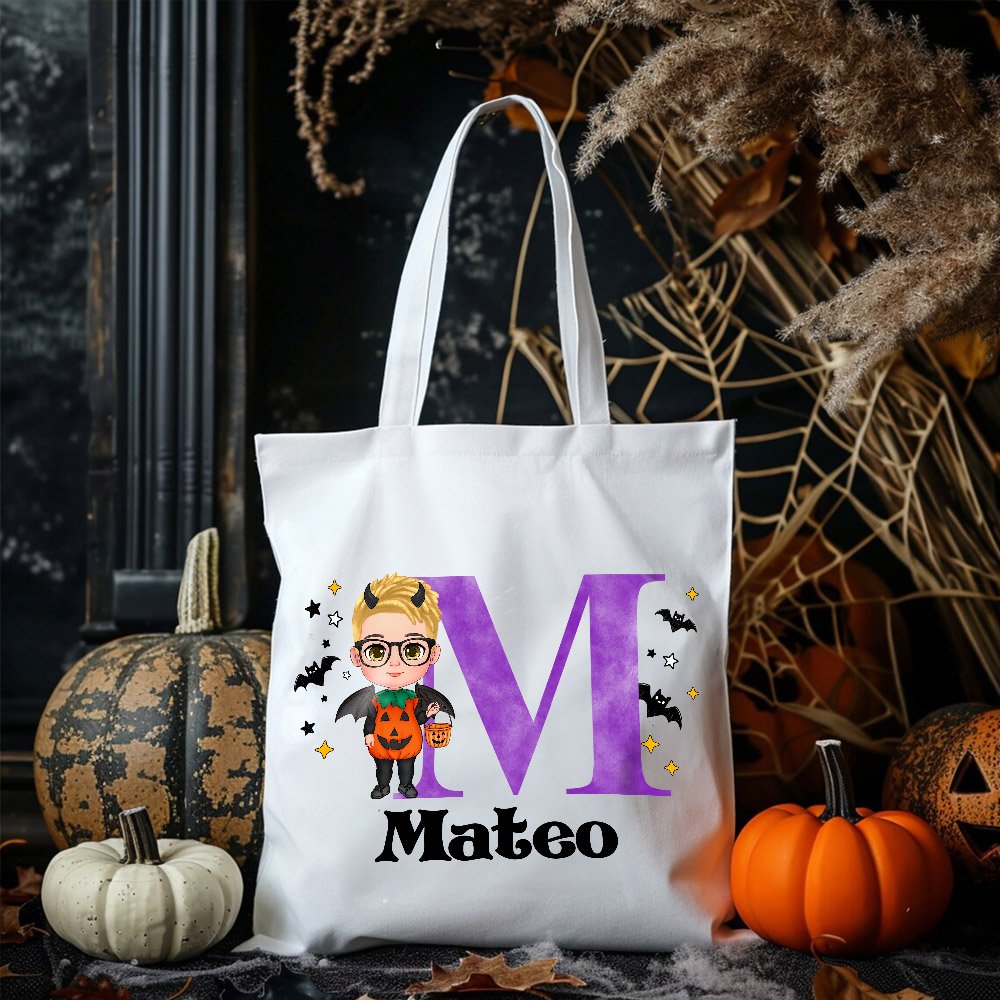 La bolsa presenta adorables dibujos animados personalizados de niño y niña, que combinan elementos clásicos de Halloween: calabaza, murciélago, sombrero de bruja, etc. Puedes personalizar el nombre y la inicial del niño, convirtiéndolo en un accesorio de Halloween único y festivo.