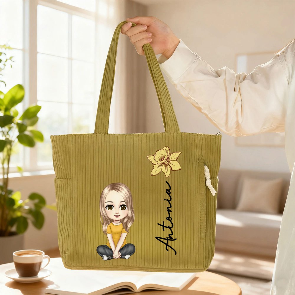 Confeccionado en suave tejido de pana, este bolso tote combina diseños personalizables de flores de nacimiento y personajes de dibujos animados, junto con la opción de personalizarlo con un nombre. Las elegantes rayas y los delicados motivos florales se entrelazan para infundir romanticismo y personalidad a tus desplazamientos diarios, garantizando que tu estilo siga siendo práctico y elegante.