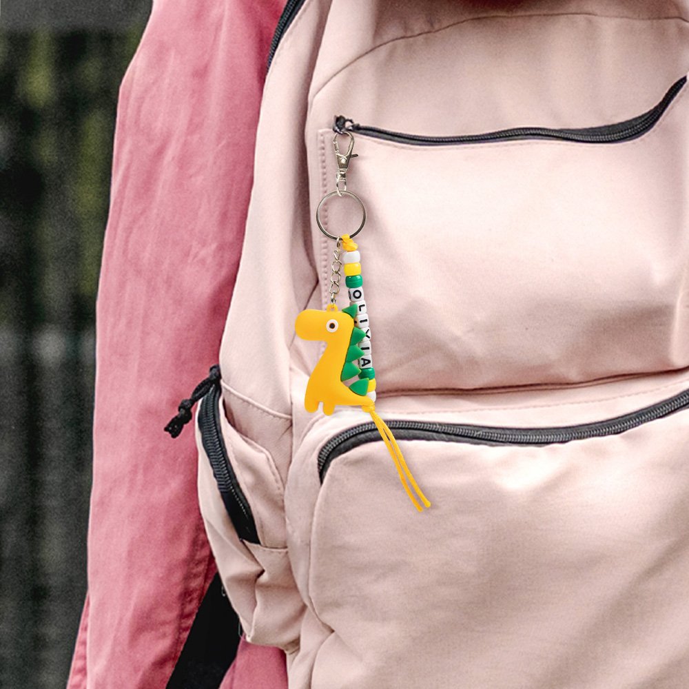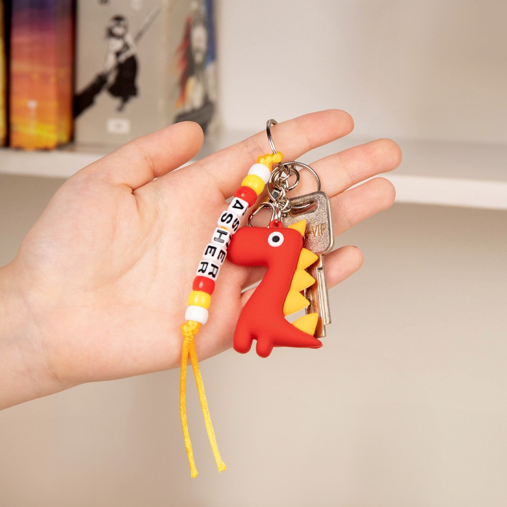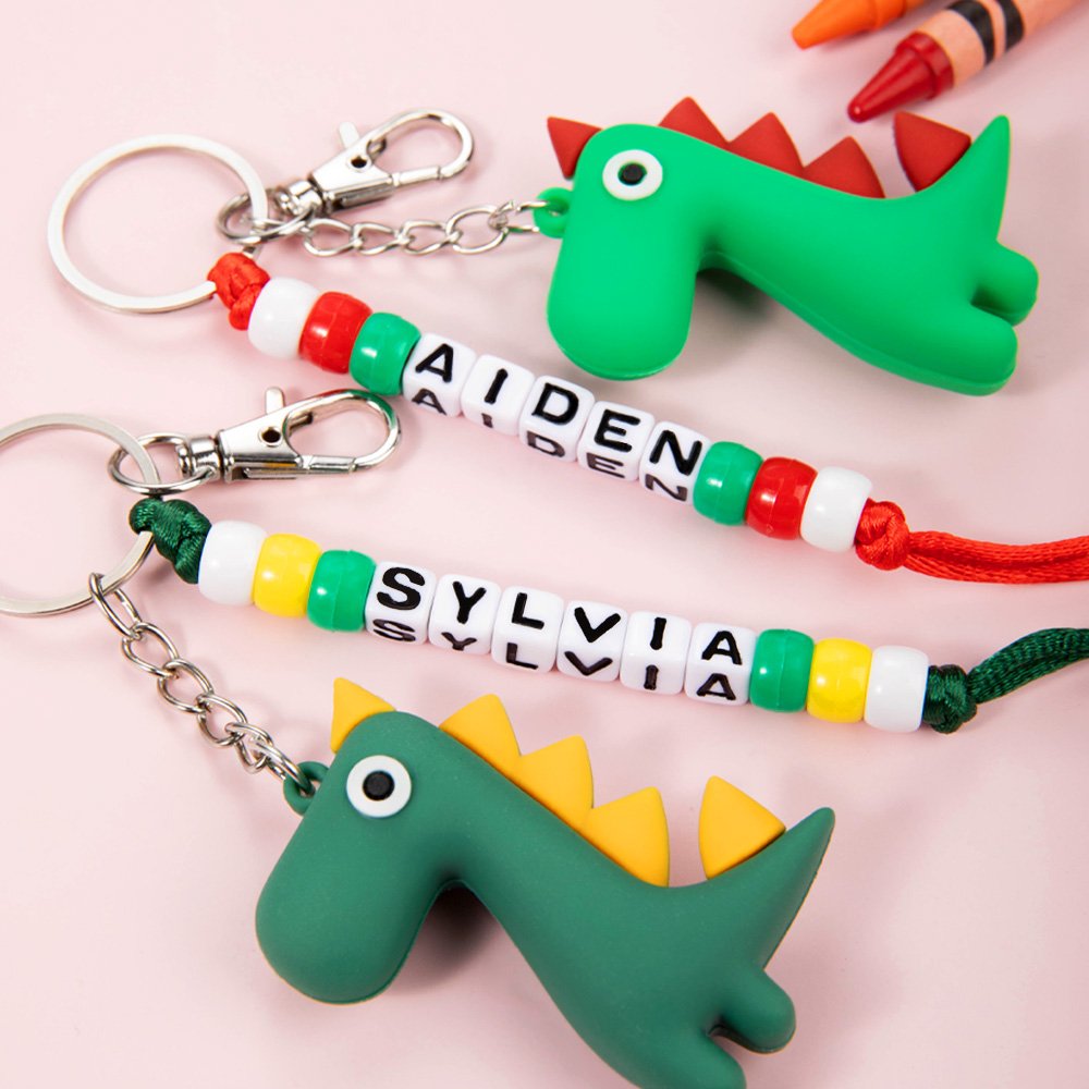 Este llavero presenta un simpático dinosaurio de dibujos animados en 3D combinado con cuentas de colores vibrantes, creando un accesorio divertido y elegante para los niños. Personalízalo con el nombre de tu hijo en las cuentas y conviértelo en un regalo único.