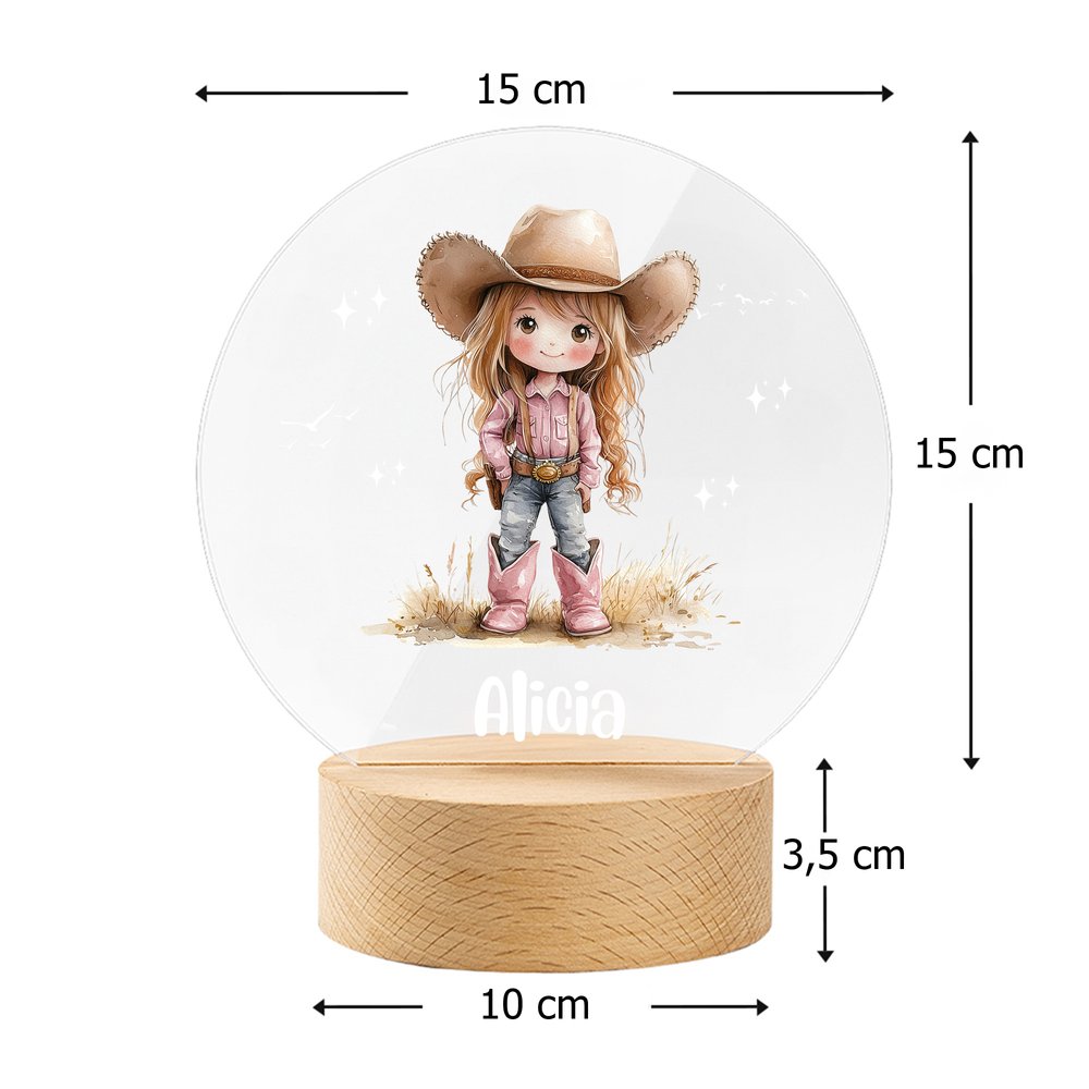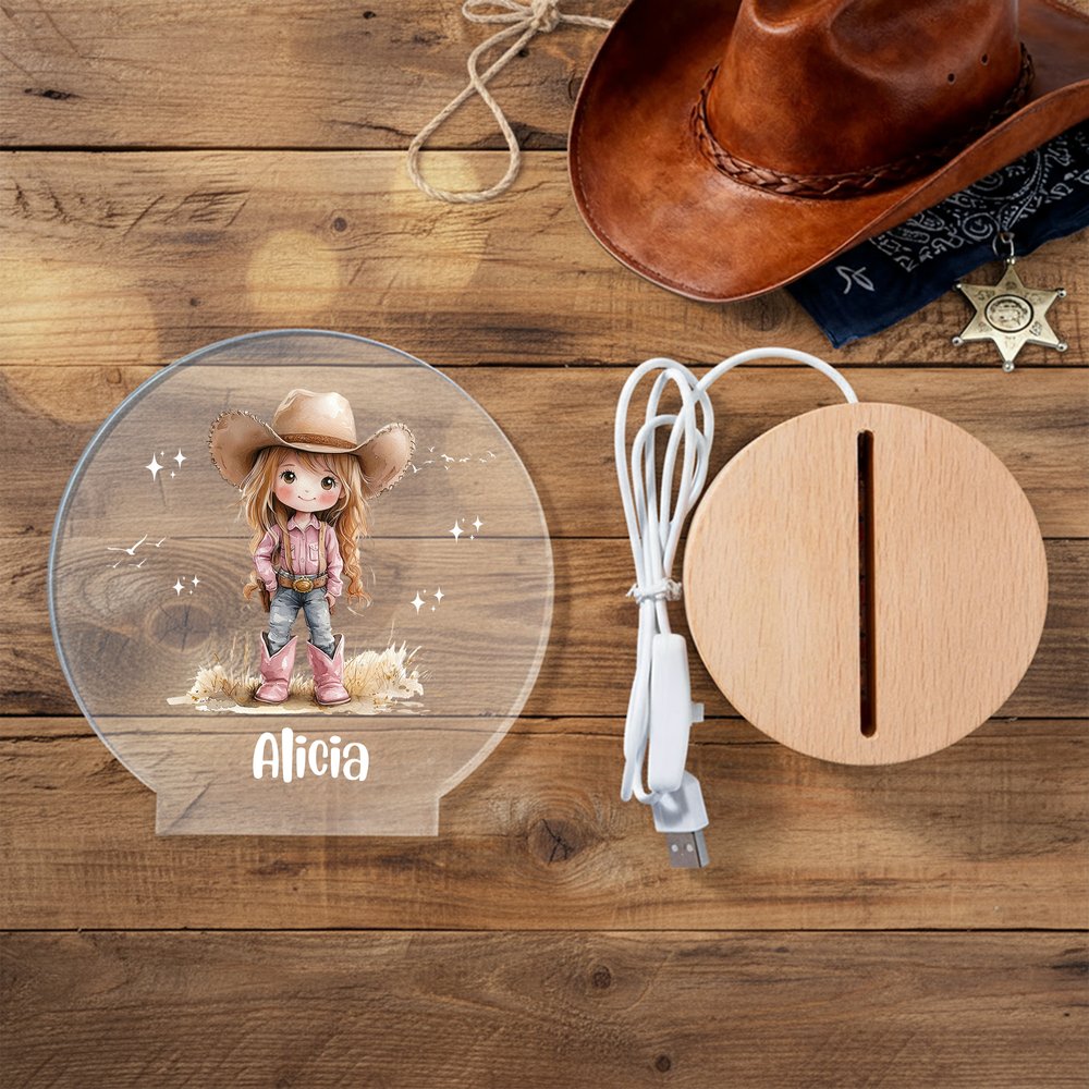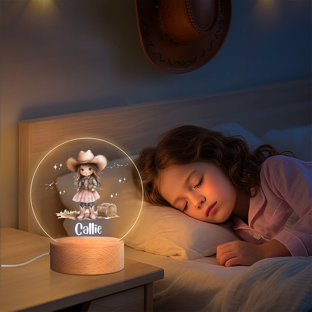 Con una simpática vaquerita como elemento central del diseño, combinada con un nombre personalizado, el diseño vibrante y animado y los intrincados detalles rompen la monotonía de las lámparas tradicionales. El estilo general irradia alegría y vitalidad, por lo que es adecuada tanto para la iluminación como para la decoración de dormitorios, inyectando un ambiente lúdico a cualquier espacio, que se adapta perfectamente a las preferencias estéticas de una niña.
