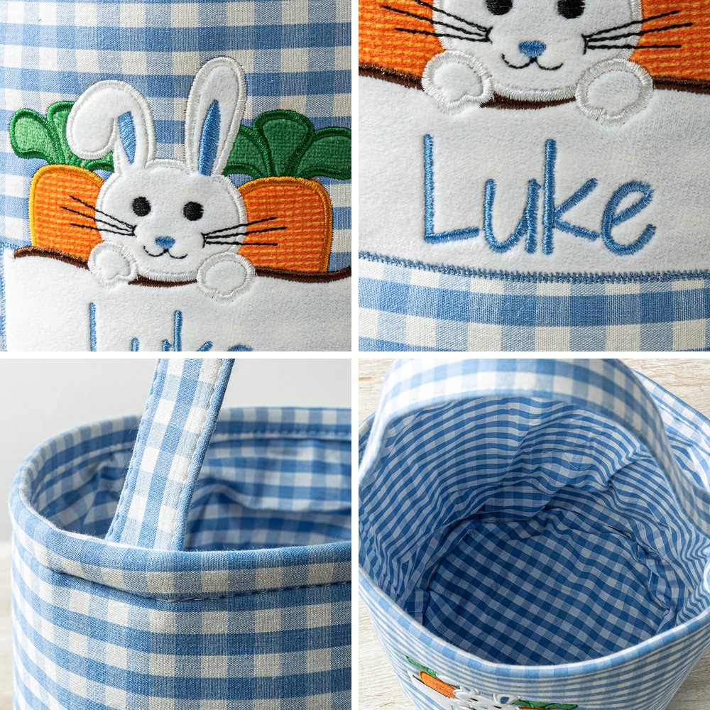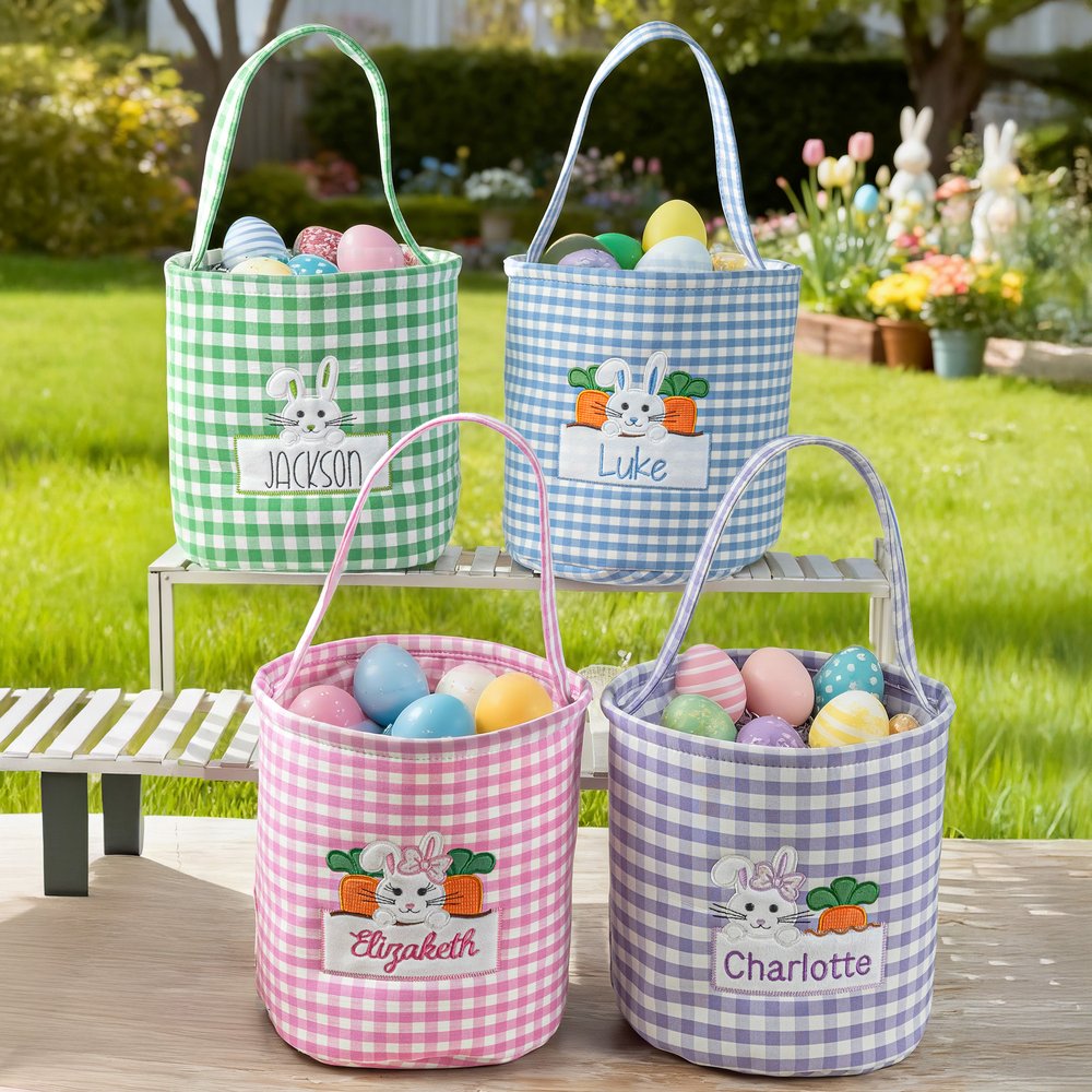 La cesta presenta un encantador estilo clásico de Pascua con un atrevido estampado de cuadros en suaves tonos pastel, un divertido conejito con un colorido lazo y un nombre personalizado bordado. Las líneas limpias y la paleta de colores vibrantes evocan el espíritu despreocupado de la primavera, mientras que la duradera construcción de tela añade un toque de encanto rústico, creando un aspecto visualmente atractivo y emocionalmente resonante que captura la magia de la Pascua para los niños.