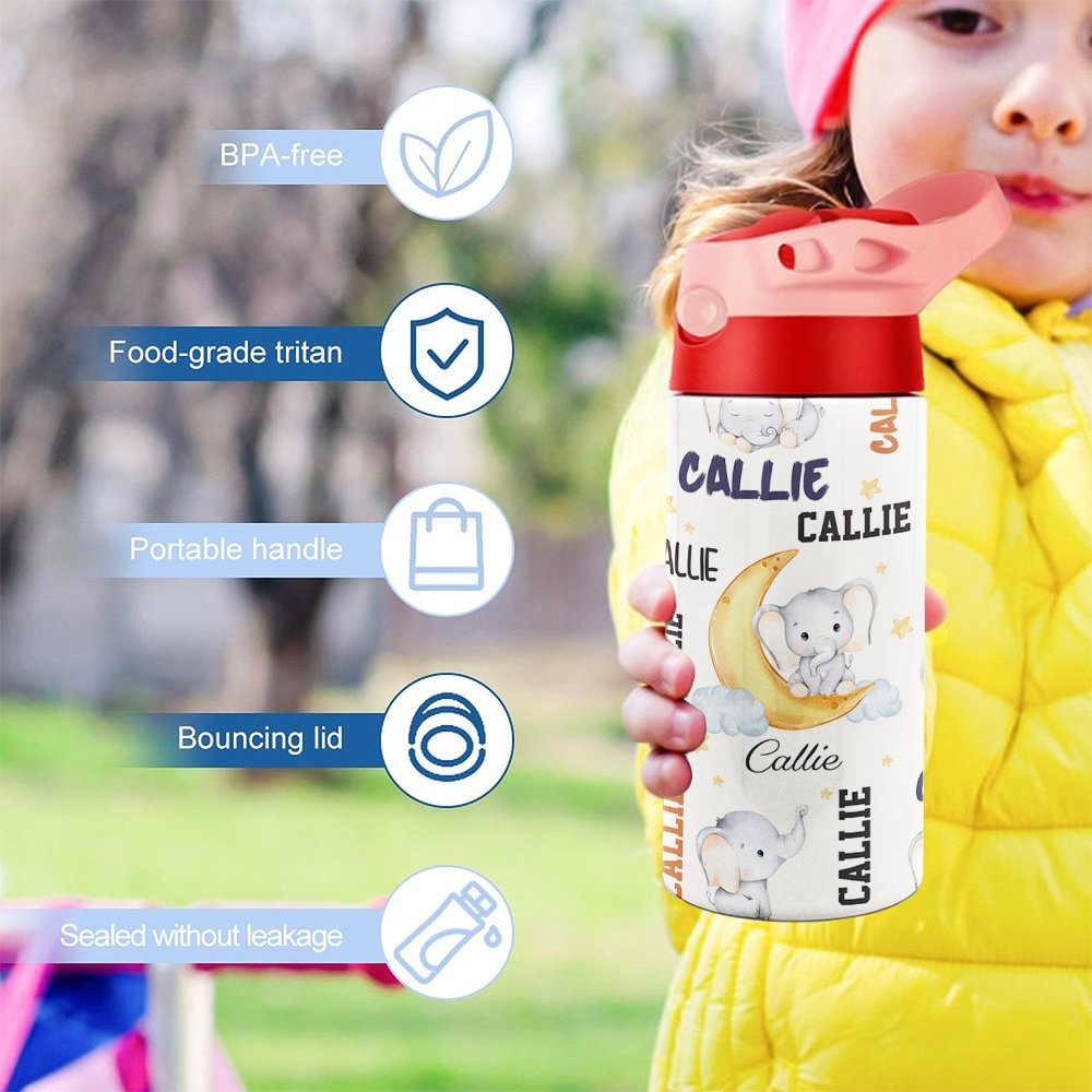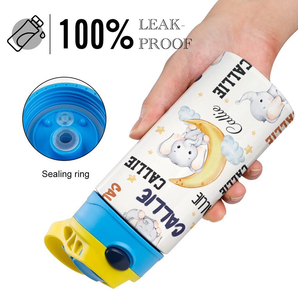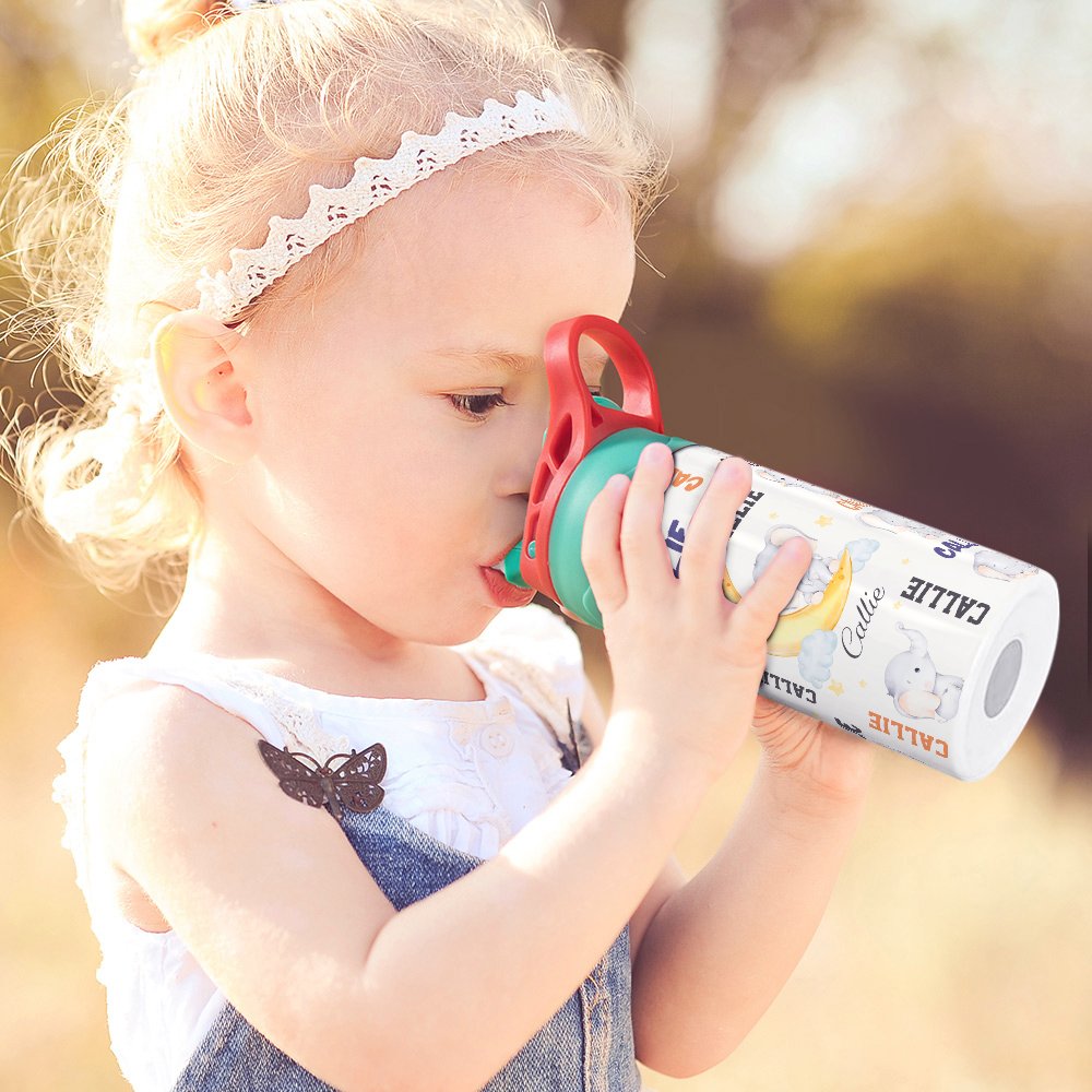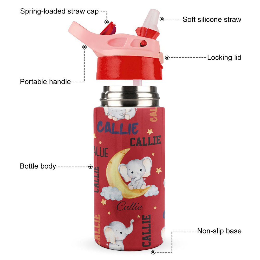 Esta botella de agua tiene un simpático diseño de elefante. Puede elegir su dibujo o diseño de elefante favorito. El diseño está lleno de inocencia e imaginación. Cada botella de agua se puede personalizar con el nombre del niño, y hay 5 colores de tapa de taza y una variedad de colores de cuerpo de taza para elegir, por lo que es único para su hijo. Puede estimular la curiosidad de los niños y convertirse en un accesorio de moda en su vida diaria.