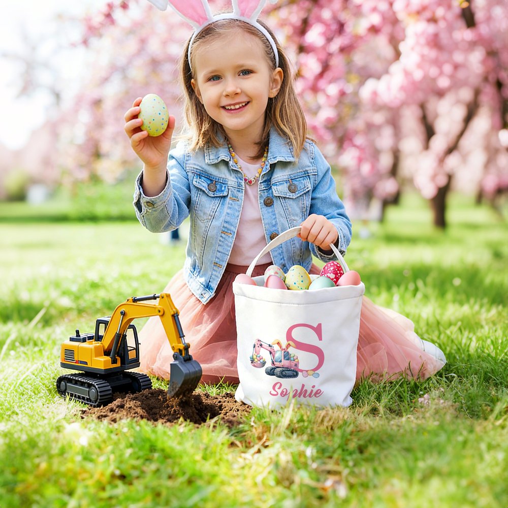 Esta cesta en forma de cubo presenta un adorable diseño de excavadora de dibujos animados con orejas de conejo y un gancho lleno de huevos de Pascua, creando un ambiente vibrante y divertido. Tanto si es una princesita como un pequeño aventurero, es perfecta para el estilo de cada niño. También puedes añadir iniciales o un nombre personalizado para crear una cesta de búsqueda de huevos de Pascua personalizada.