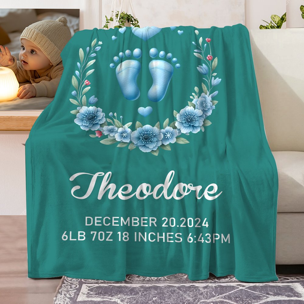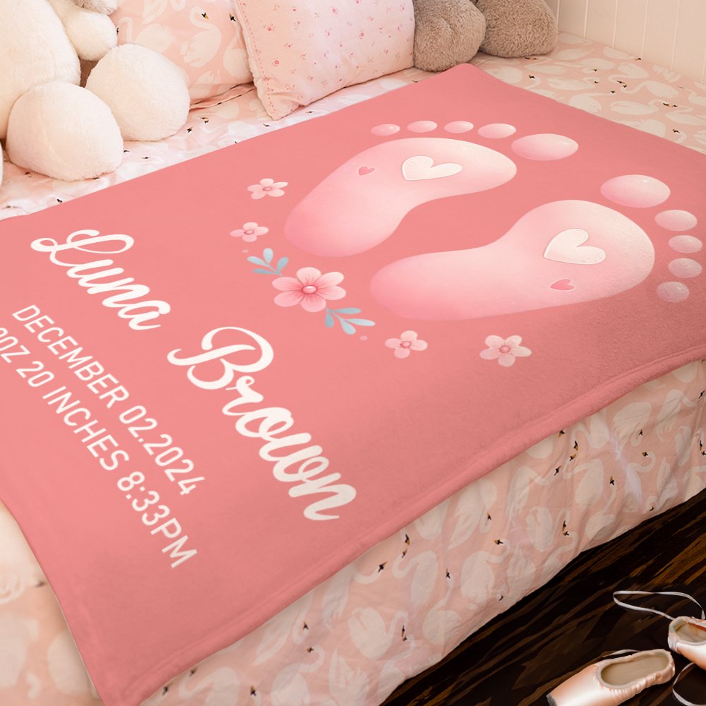 Esta manta utiliza un bonito estampado de pies de niño, que simboliza las huellas del crecimiento del bebé. Hay dos opciones de color, rosa y azul, y bajo cada color hay 23 dibujos diferentes para que elija, satisfaciendo su búsqueda de personalización. Además, la manta también permite personalizar el nombre del niño y los datos de nacimiento, lo que hace que cada manta sea única y esté llena de significado conmemorativo.