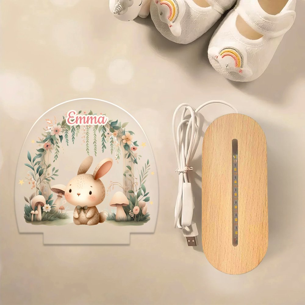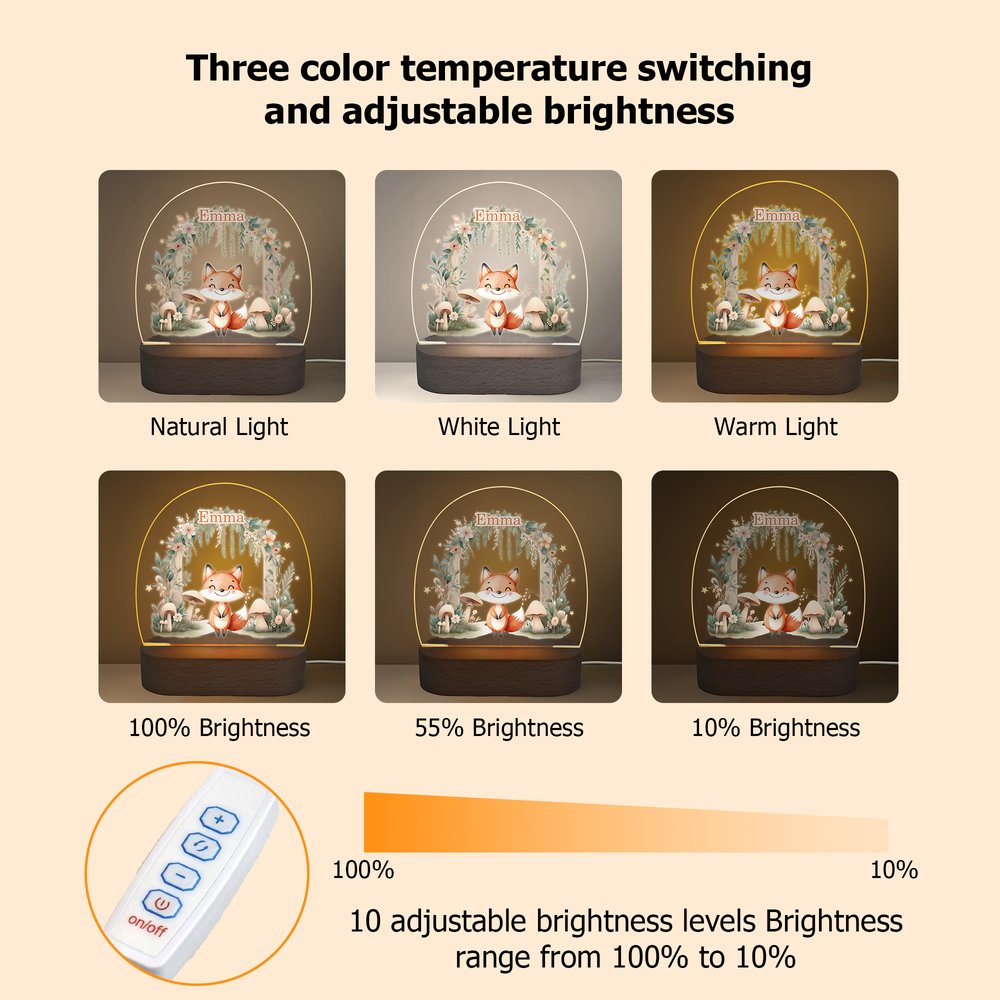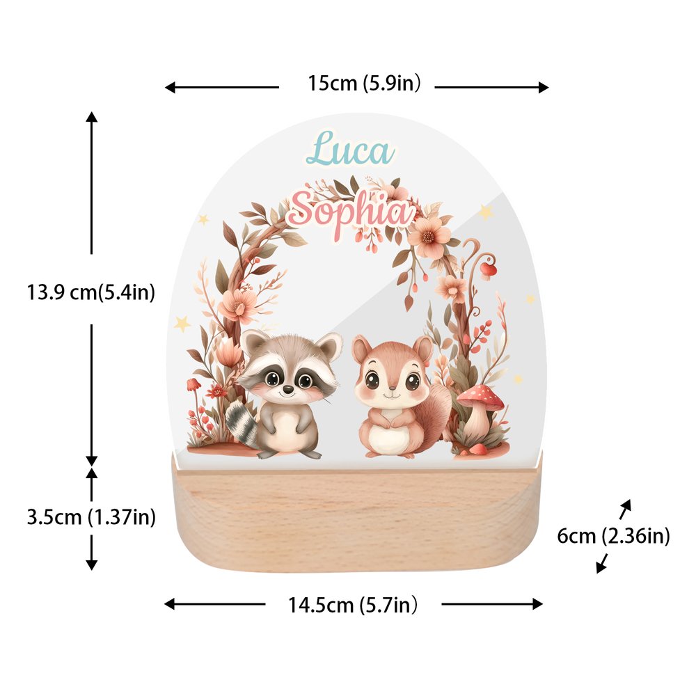 Esta luz nocturna acrílica presenta 42 simpáticos animales y un fondo de arco de bosque. Puedes elegir diseños de uno o dos animales y personalizar los nombres de los niños. Está llena de diversión infantil y es única.