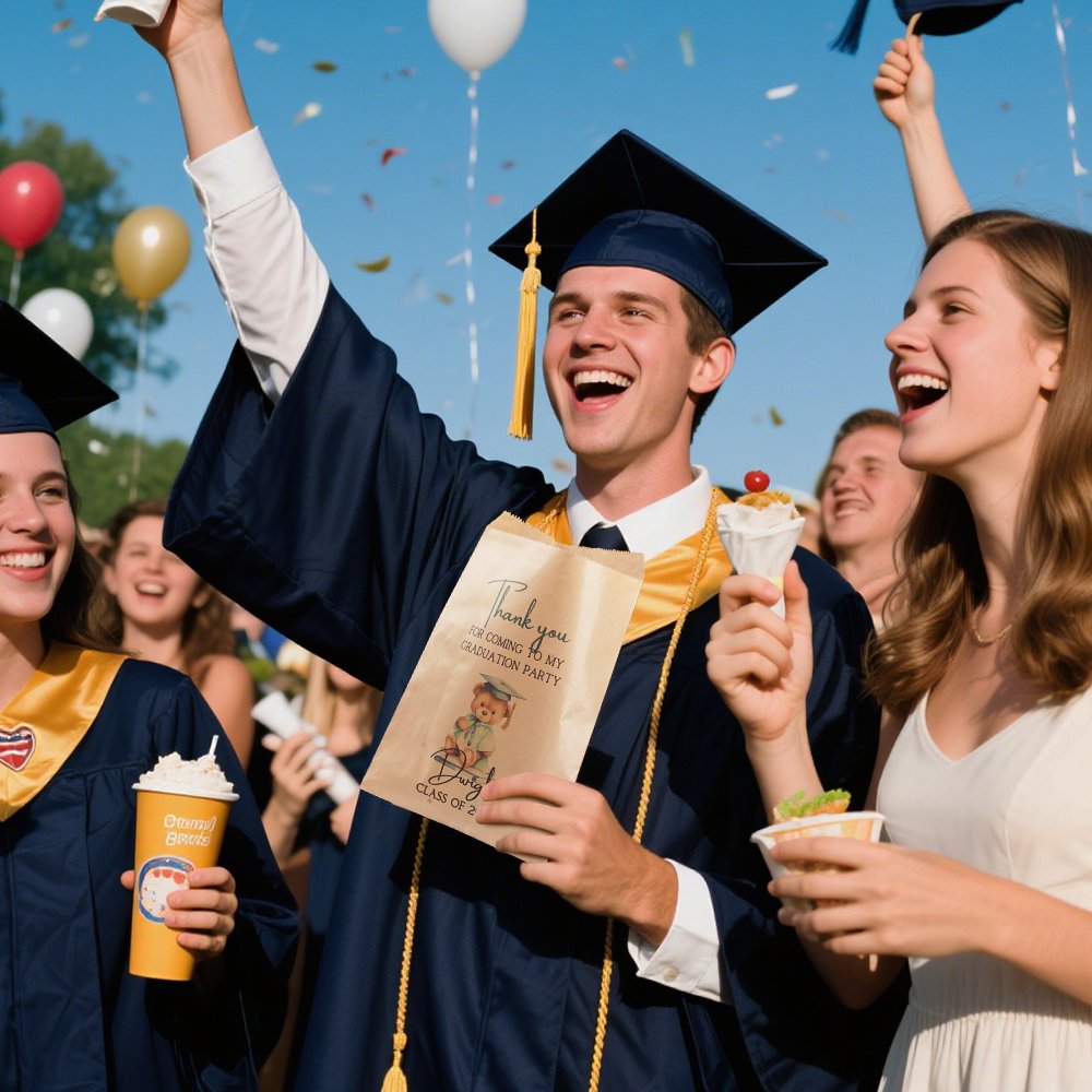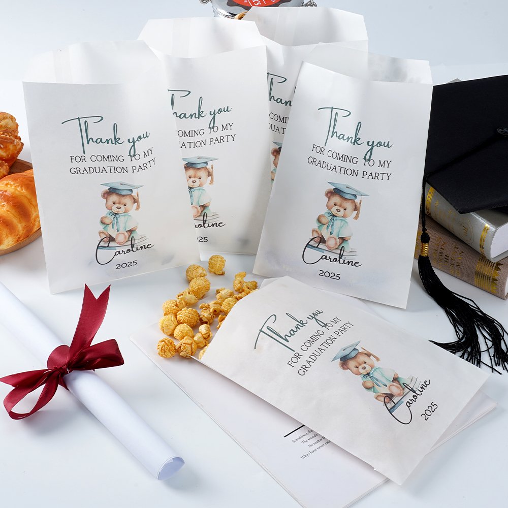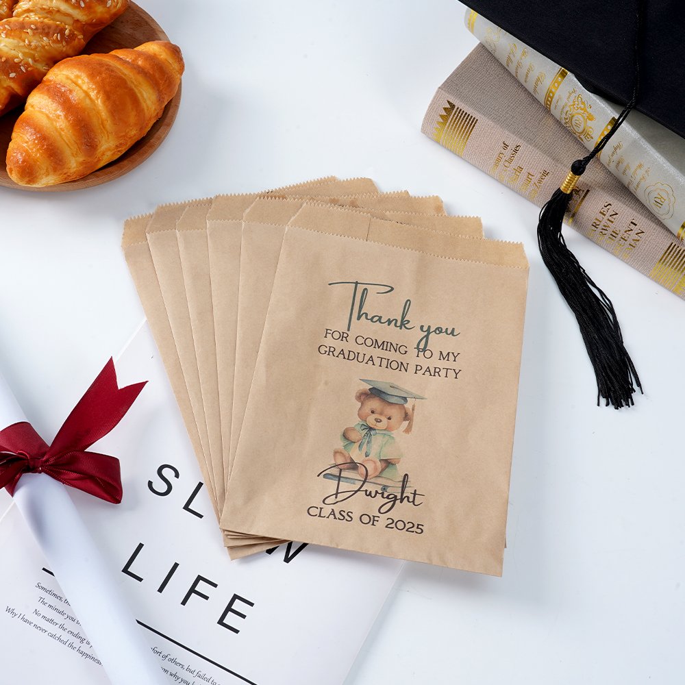Celebra los logros académicos con esta adorable bolsa de regalo con un osito de peluche que lleva un birrete de graduación clásico y una conmovedora palabra de agradecimiento: "Gracias por venir a mi fiesta de graduación". Personalizable con tu año de graduación y tu nombre, el diseño lúdico y personalizado captura la alegría y la emoción de la graduación, convirtiéndola en un recuerdo memorable para graduados de todas las edades.