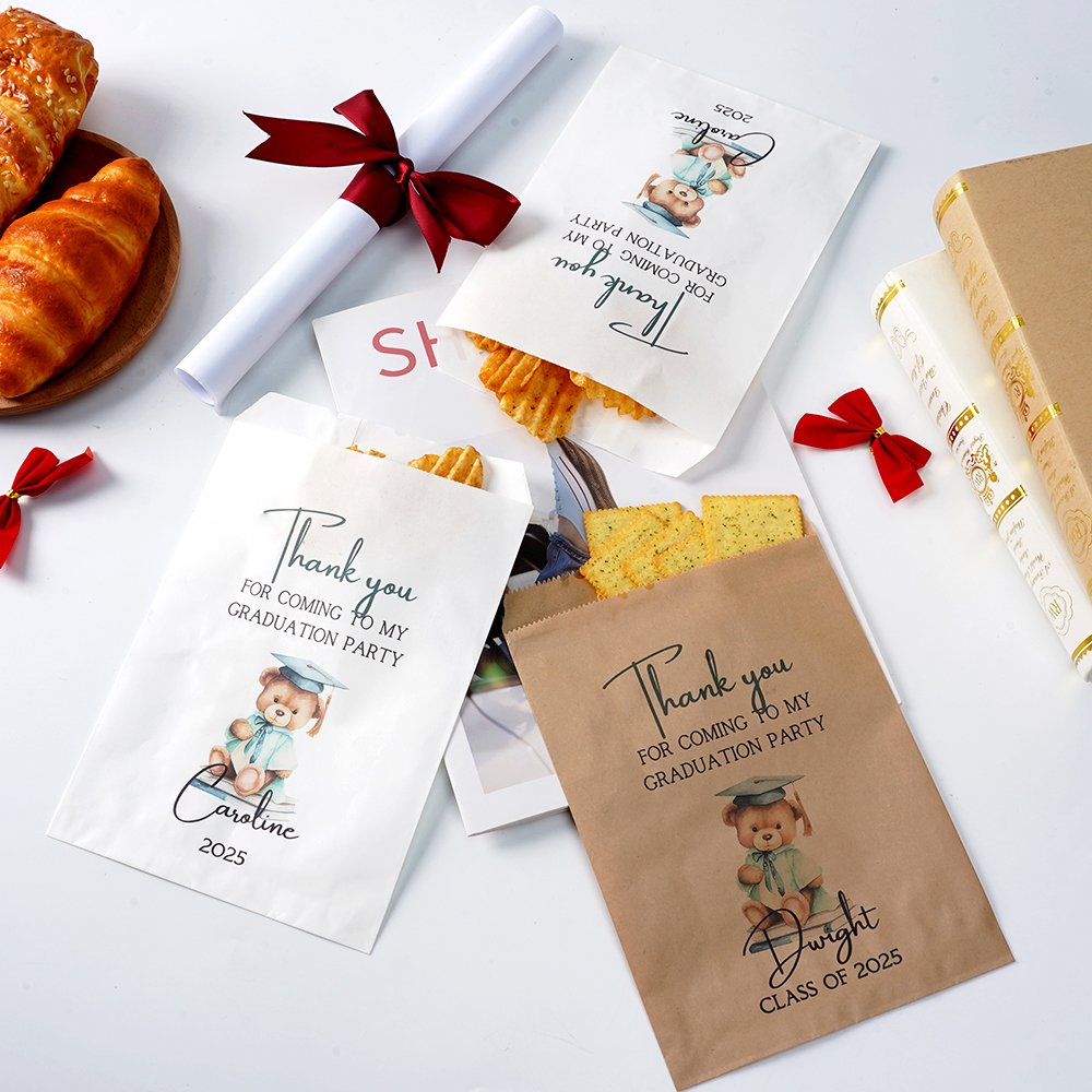 Las bolsas para golosinas son una forma práctica de llevar aperitivos y una elegante decoración para fiestas que encantará a todos. Son ideales para rellenarlas con aperitivos variados, como palomitas, galletas, pretzels, caramelos, chocolate, frutos secos o cualquier otra golosina del tamaño de un bocado. Estas bolsas para golosinas no sólo son perfectas para la comida, sino que también pueden contener pequeños regalos o detalles para fiestas. El elegante diseño y los colores naturales añaden un toque festivo a la decoración de su fiesta de graduación, creando un ambiente de alegría y logro.