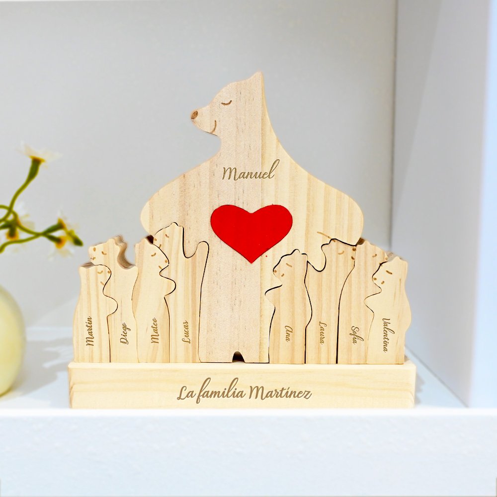 Este rompecabezas de madera presenta a osos de dibujos animados abrazándose fuertemente con un corazón rojo en el centro, simbolizando el calor y la cercanía de la familia. También se puede personalizar con 2 a 9 osos y nombres para representar a cada miembro de la familia, añadiendo un toque personal a tu espacio.