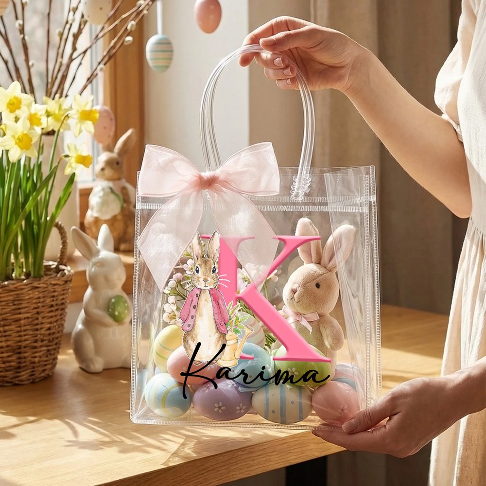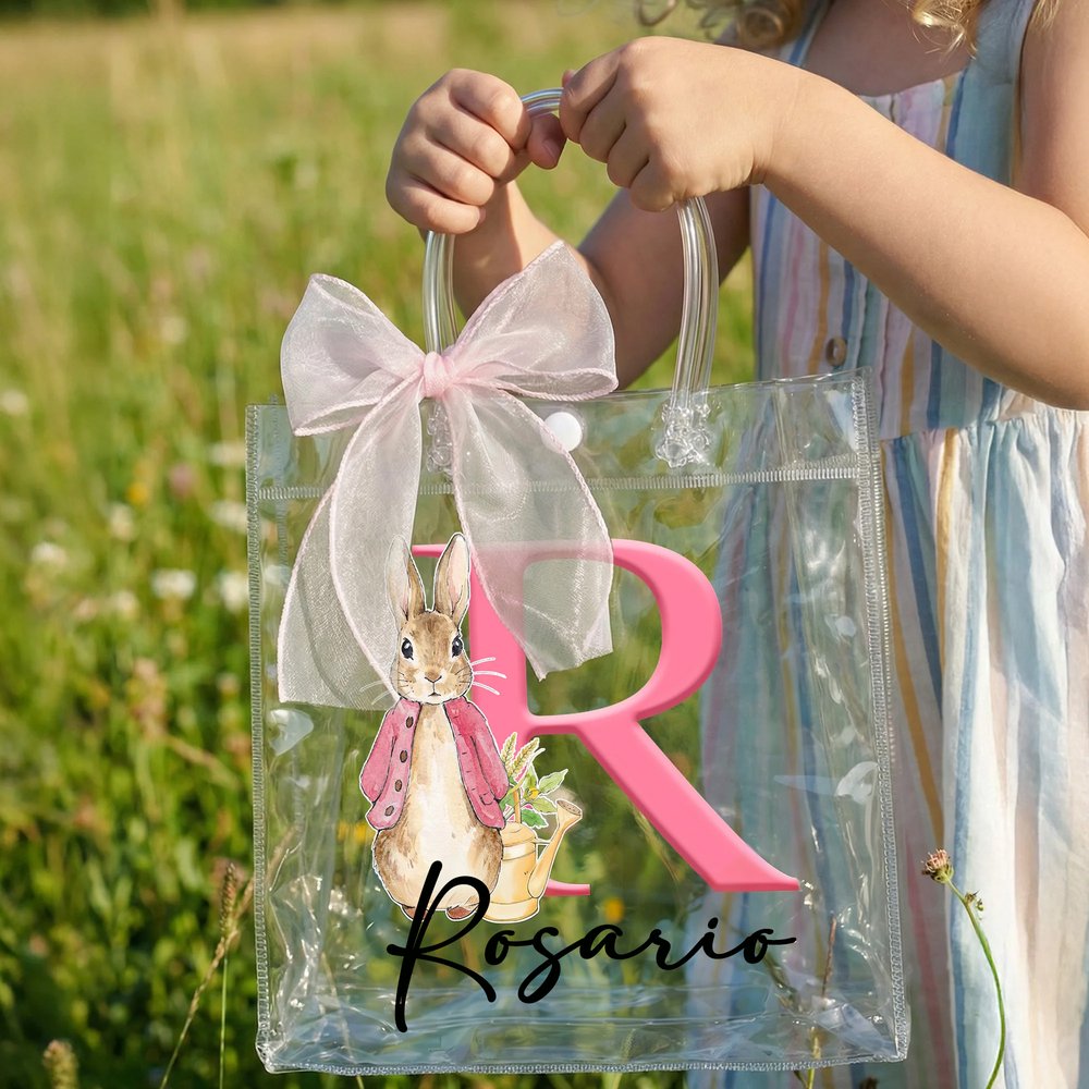 Esta bolsa transparente presenta un adorable y encantador Peter Rabbit de Pascua como elemento central de su diseño, combinado con una suave cinta de lazo rosa, llena de festiva alegría infantil y dulce encanto. Puedes personalizarla con un nombre y unas iniciales especiales, haciendo de cada bolsa un regalo personalizado realmente único.