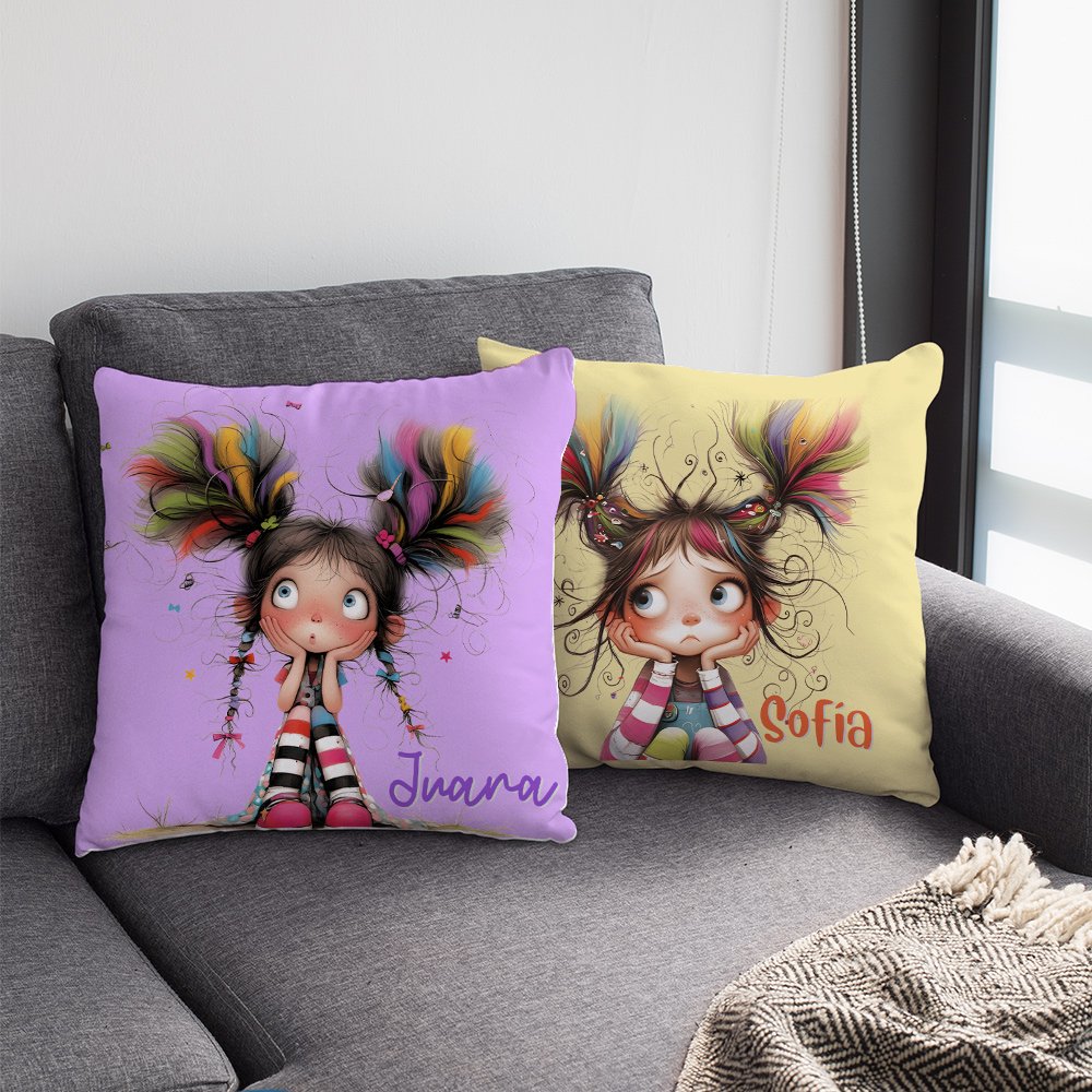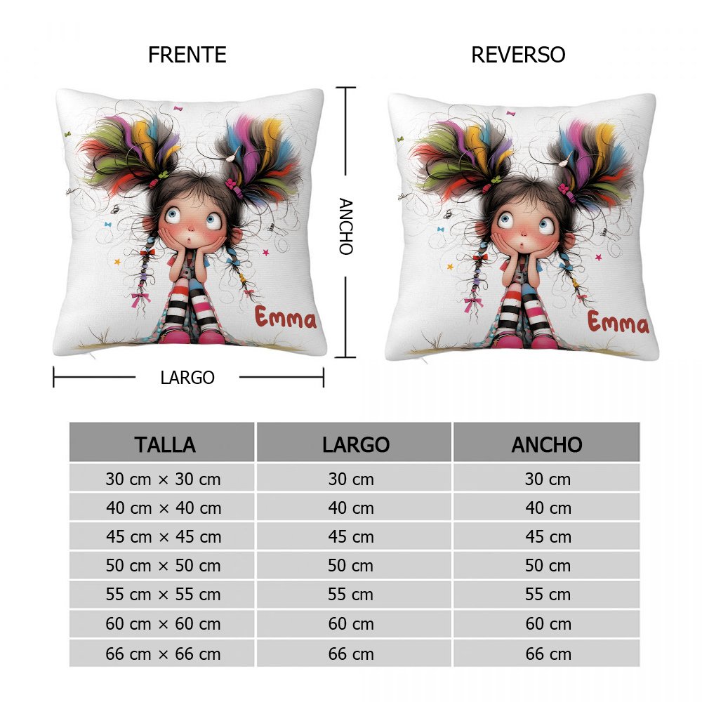 Esta funda de cojín presenta a una niña de dibujos animados con un estilo alegre y original, que aportará un toque divertido a la decoración de tu hogar. Su diseño encantador alegrará a quien la reciba como regalo, convirtiéndola en un accesorio destacado para cualquier habitación. Personalízala con un nombre para crear una pieza única que refleje tu personalidad o la de alguien especial, y hazla un detalle inolvidable en cualquier espacio.