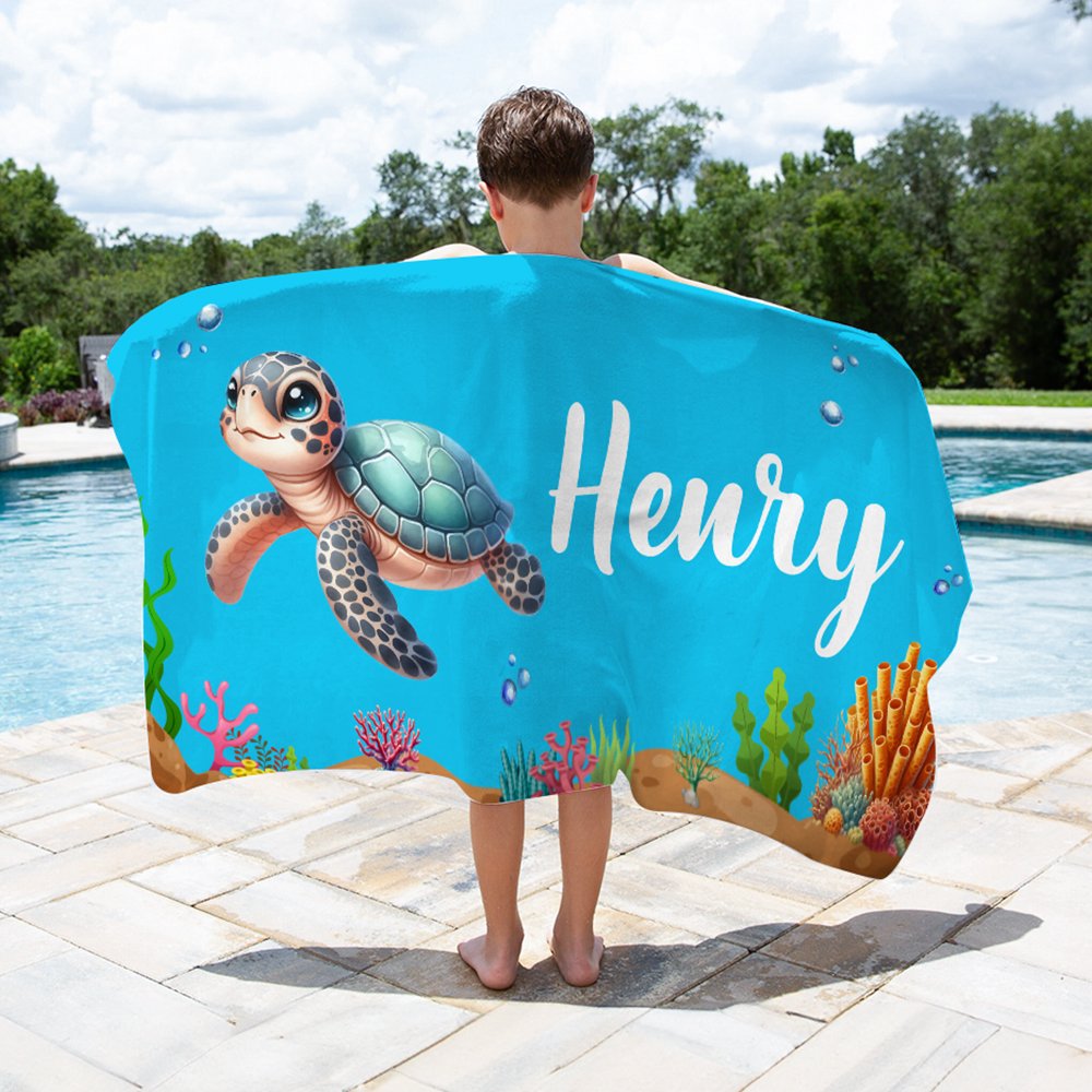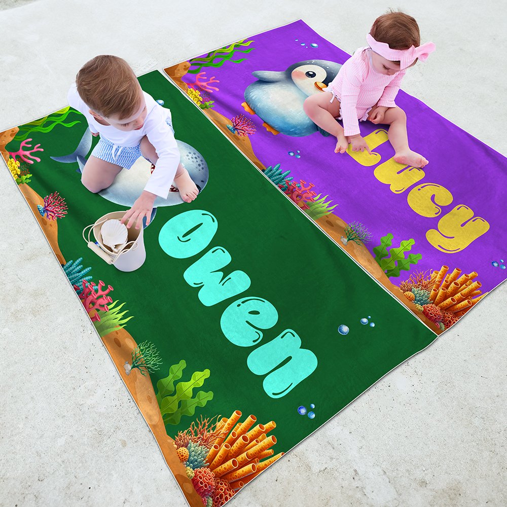 Esta toalla de playa de gran tamaño presenta un diseño de animales marinos y viene con 46 animales marinos y 24 colores de fondo para elegir. Puedes personalizarla con tu nombre para crear un regalo único que hará que tus momentos en la playa o las vacaciones de verano sean más personales.