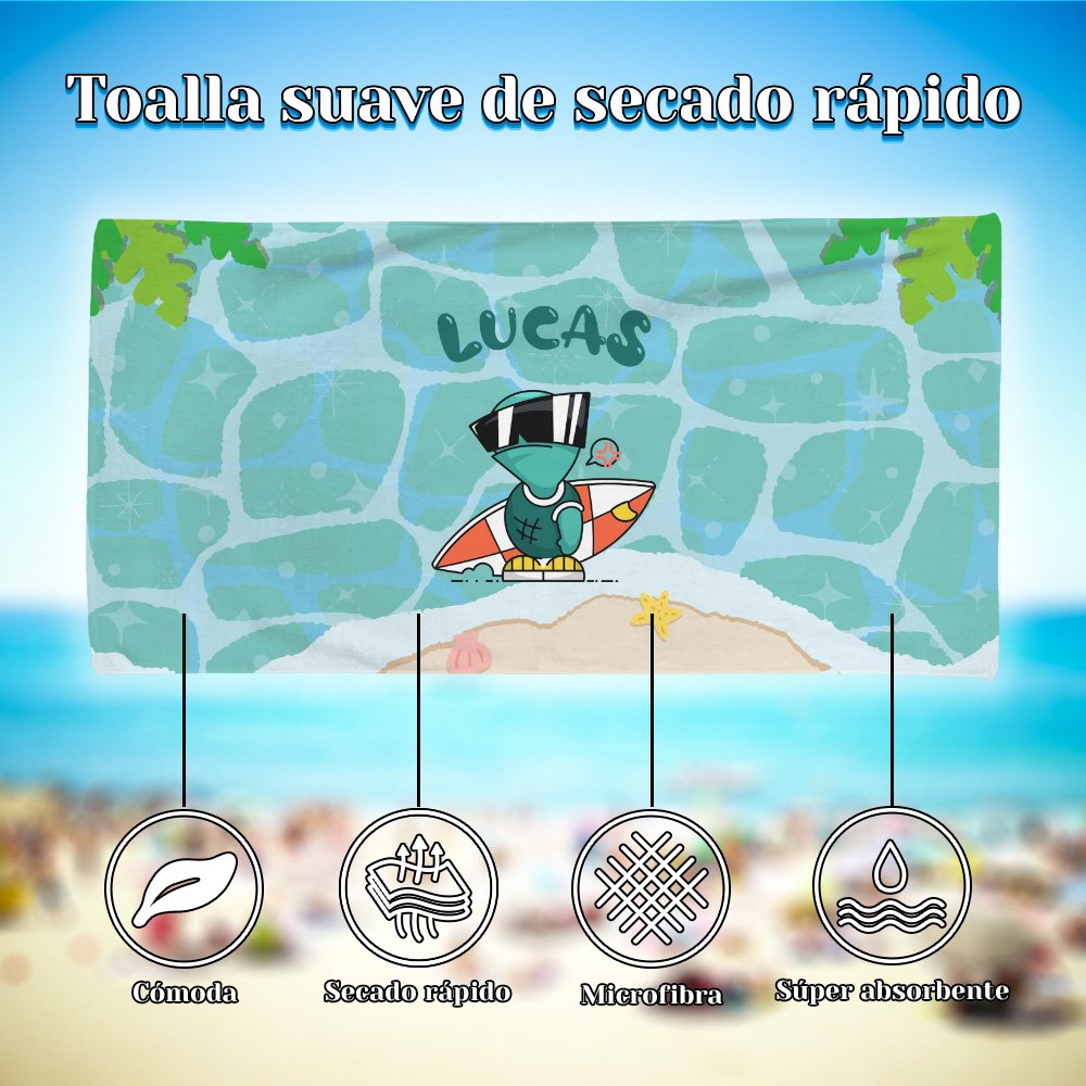 El diseño de esta toalla de playa presenta elementos del océano y el surf, con una estética colorida y infantil. Cada toalla de playa está impresa con patrones únicos de animales marinos, como tiburones, ballenas, tortugas y megalodones. Con nombres personalizados, cada toalla de playa es única.