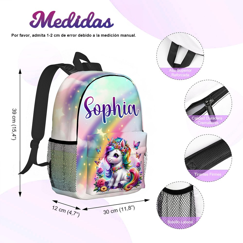 Nuestra mochila escolar para niños está diseñada con cinco fondos de arco iris de ensueño y quince dibujos de fantástico unicornios diferentes para satisfacer la búsqueda de personalización y un mundo de fantasía de los niños. Añadir el nombre del niño la convierte en una mochila única que los niños adorarán y apreciarán.