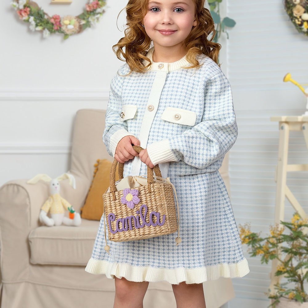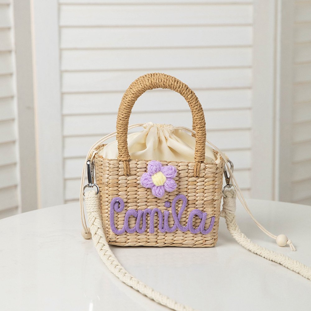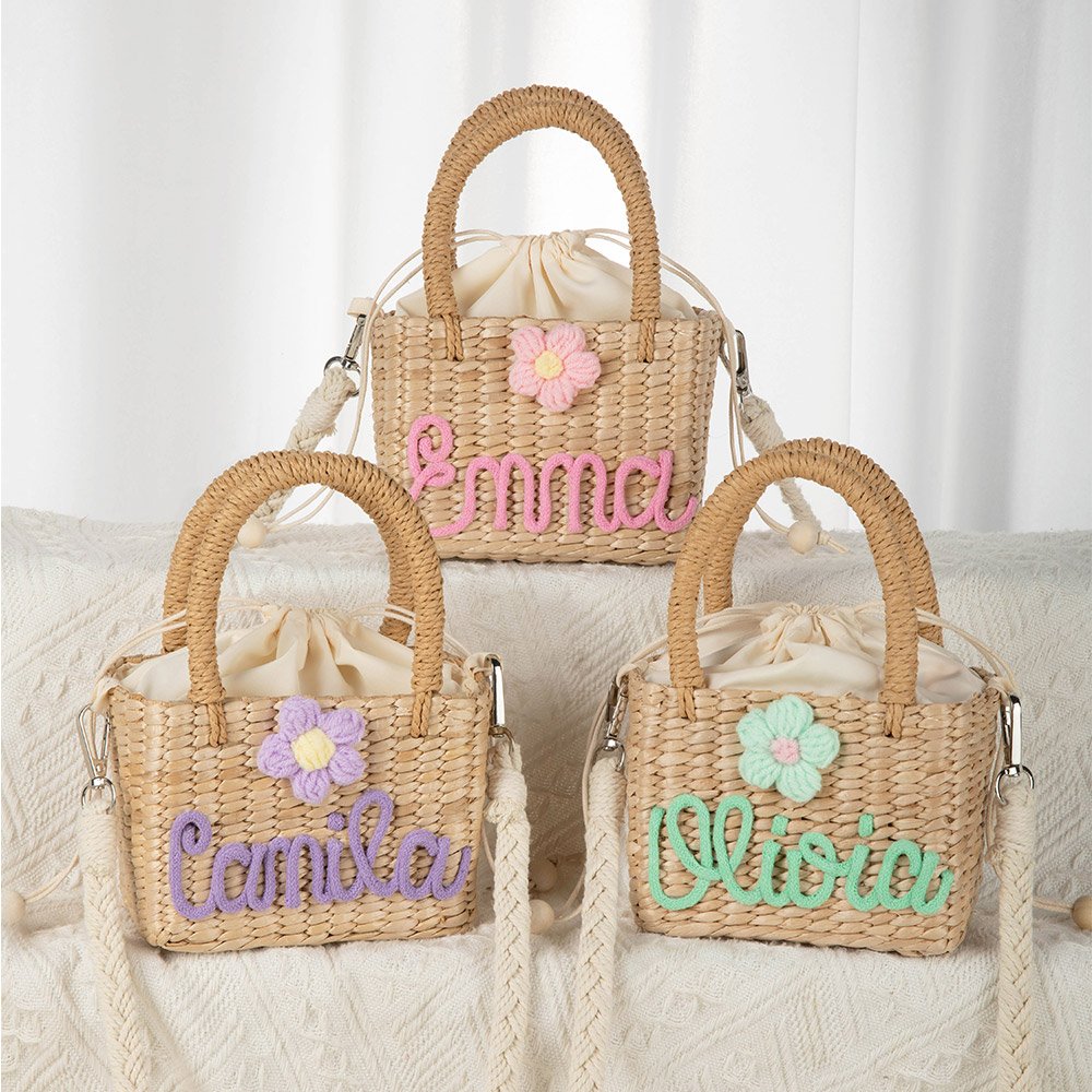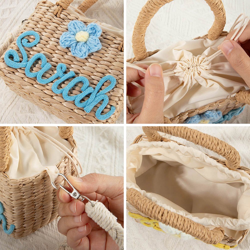 El bolso está hecho de paja tejida a mano, con decoración tridimensional de flores de cuerda trenzada de colores suaves, que es dulce y bonita, llena de atmósfera de cuento de hadas. También puede hacer que el nombre de su hijo en la bolsa, que está lleno de exclusividad y mejora la auto-identidad y pertenencia.