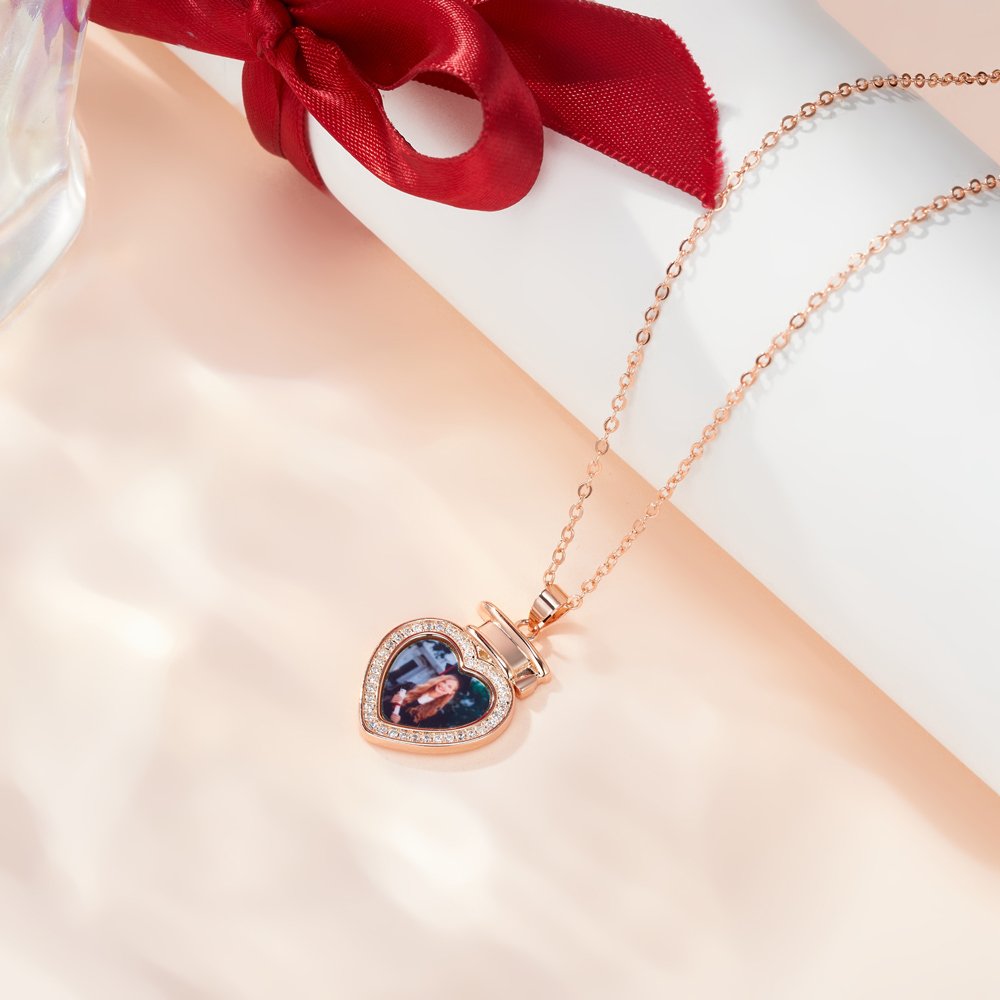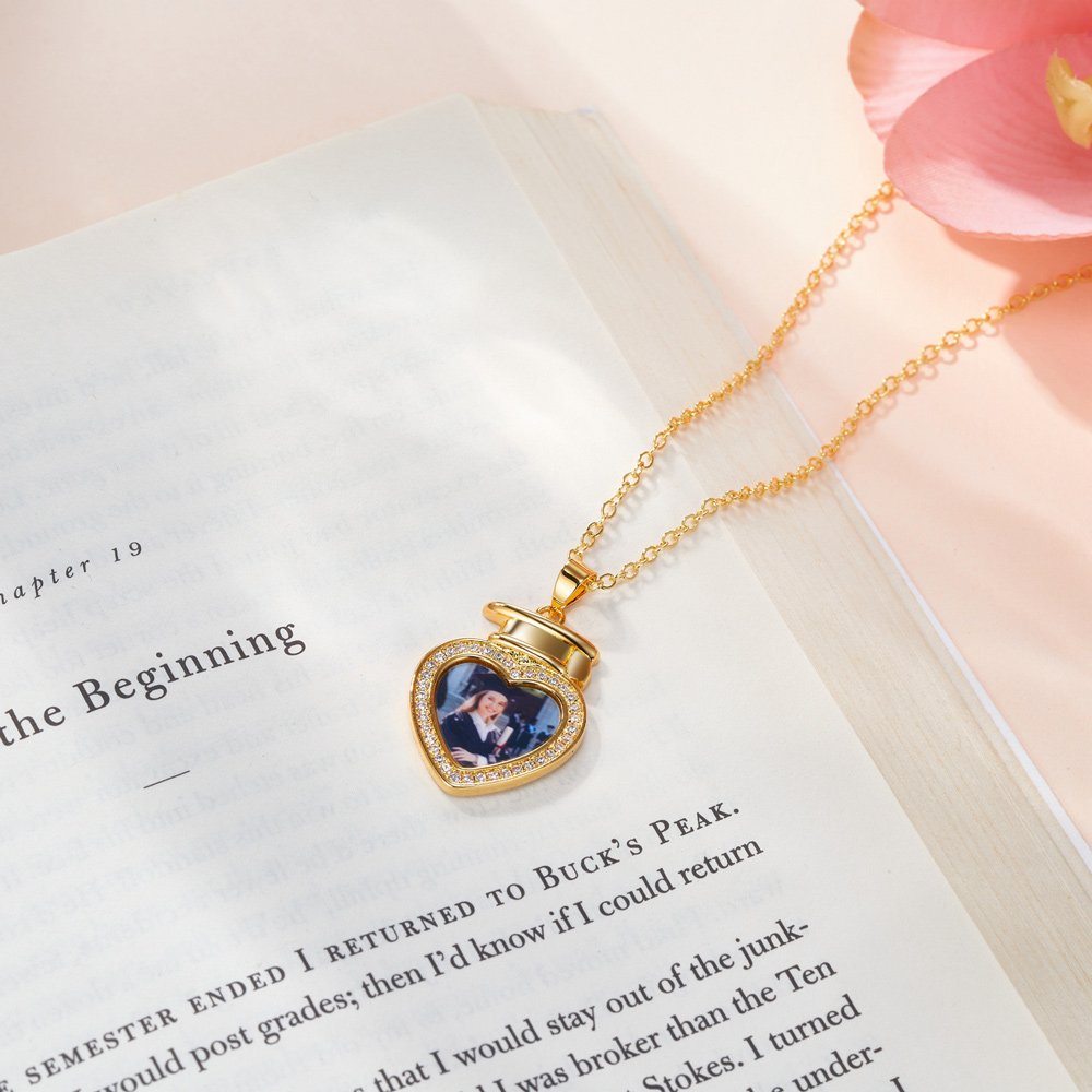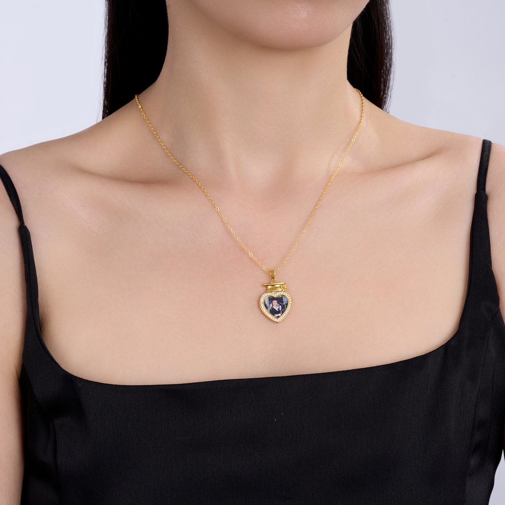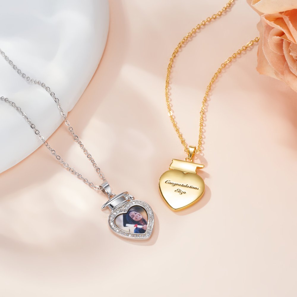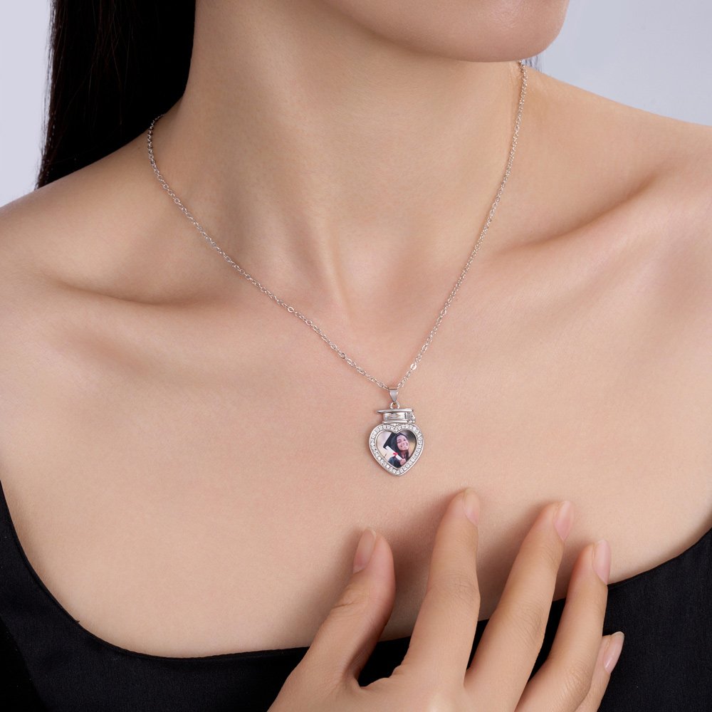 Nuestro collar con foto captura los momentos inolvidables de la graduación. El colgante está diseñado con la forma de un birrete de graduación en forma de corazón. La foto se personaliza en el colgante, y el borde se cubre con circón, que es brillante y resplandeciente, haciendo que los recuerdos sean vívidos e íntimos. La parte posterior del colgante se puede personalizar con dos líneas de texto para dejar sus buenos deseos, lo cual es exquisito.