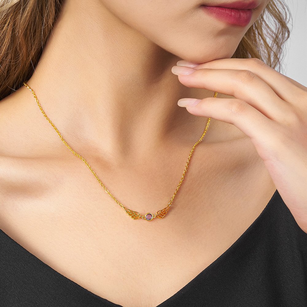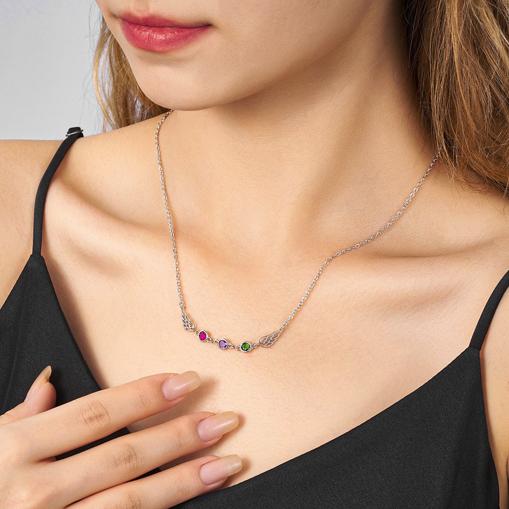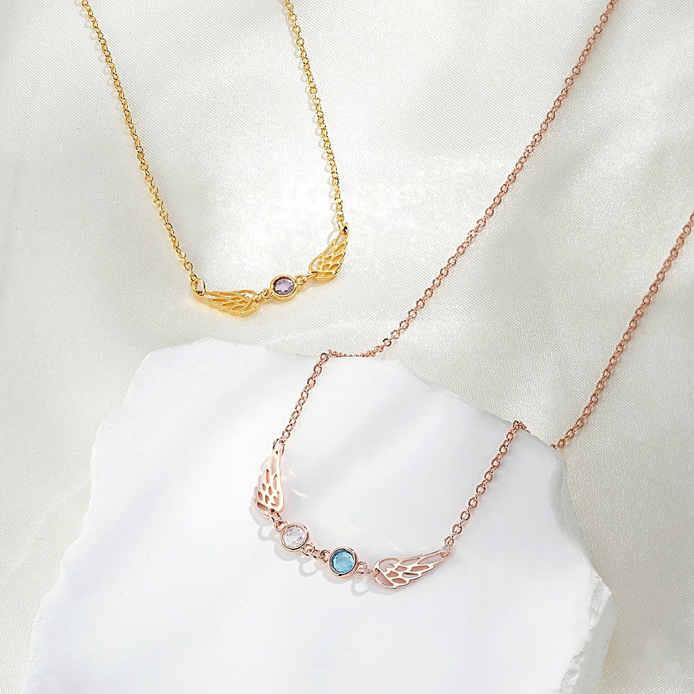 El colgante de piedra de nacimiento situado entre las alas de ángel añade encanto. Puede personalizar hasta 3 piedras según el mes de nacimiento del portador, añadiendo un toque personal. La piedra preciosa está cuidadosamente engastada, captando la luz con gran belleza y añadiendo un sutil brillo al collar.