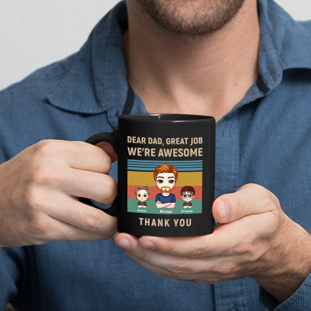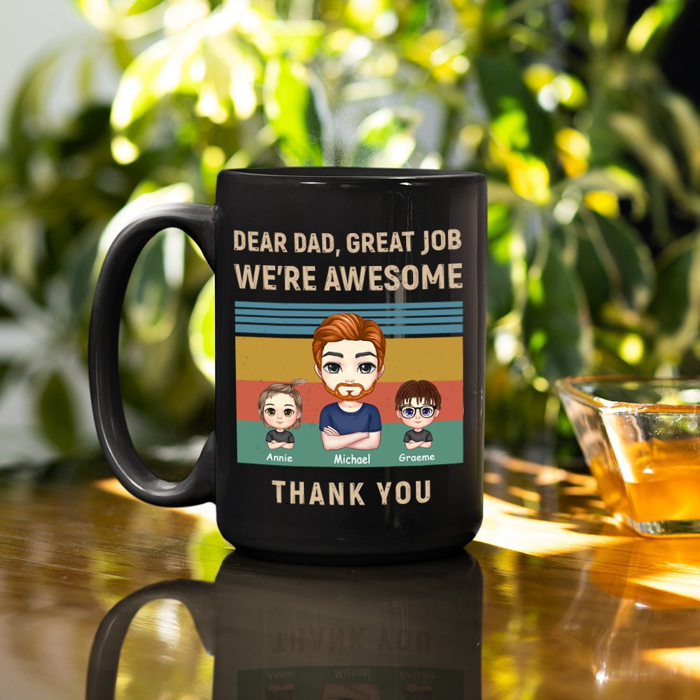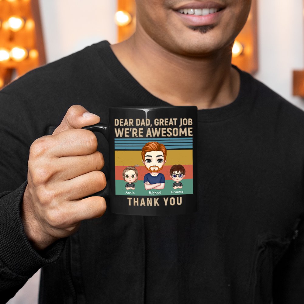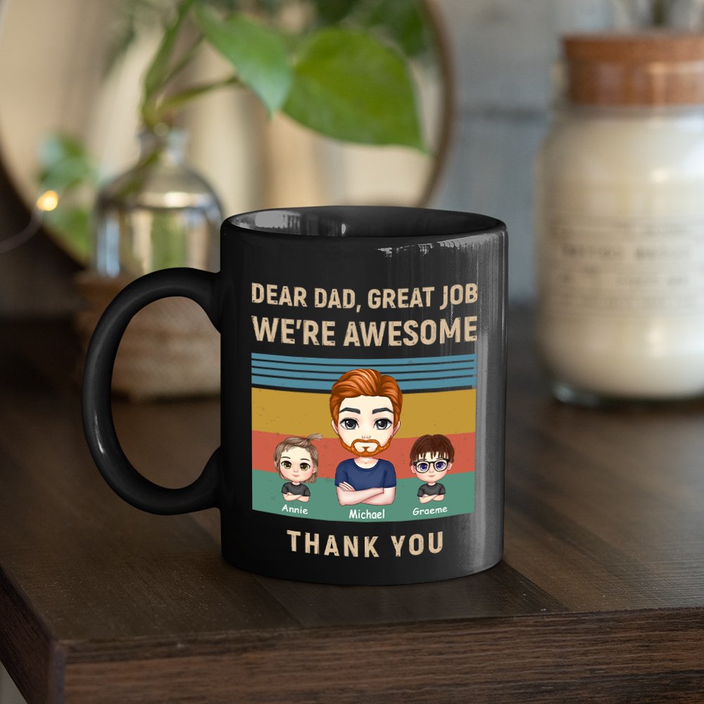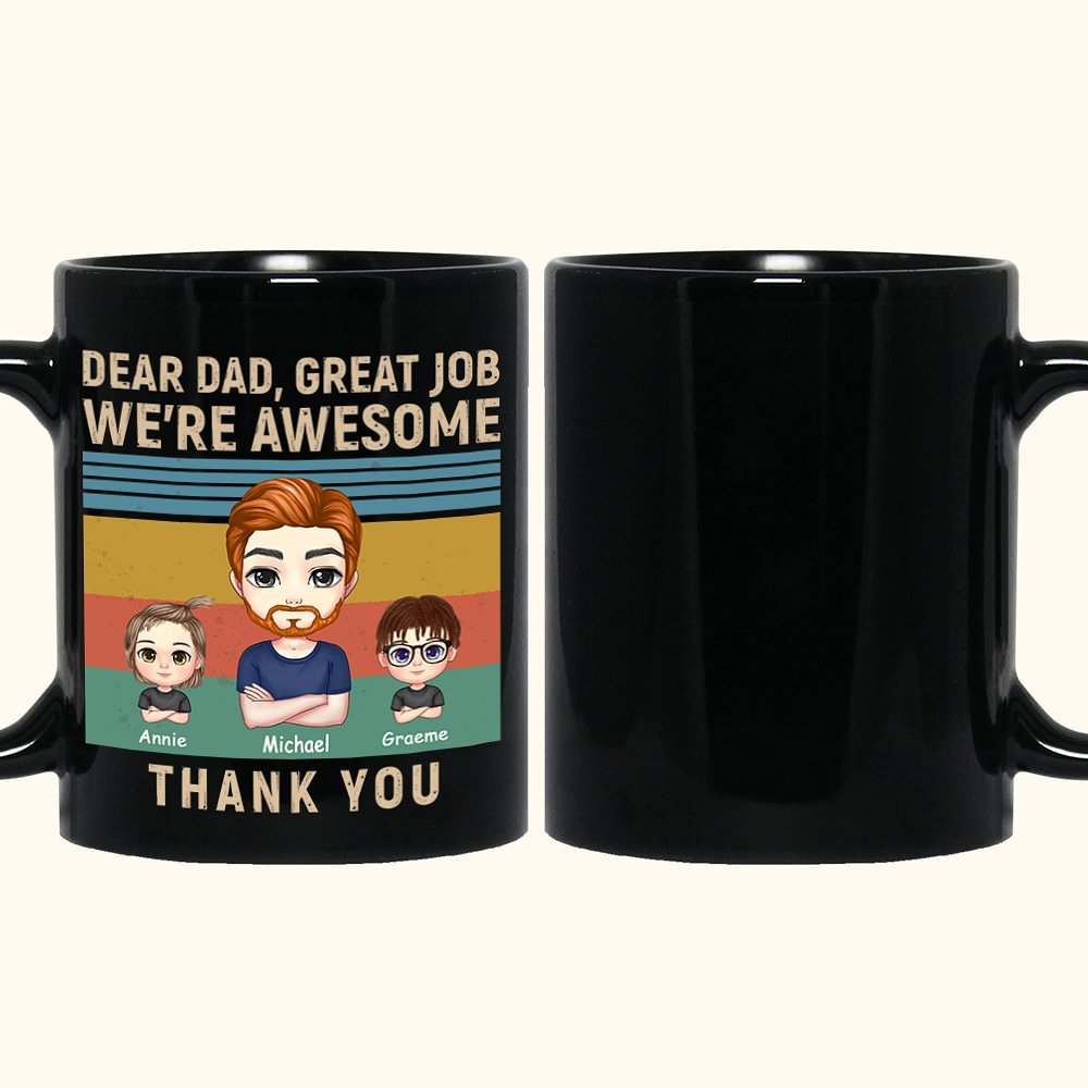 Taza de cerámica negra personalizada Dear Dad Good Job Awesome Thanks Kid es un regalo perfecto para tu padre en su cumpleaños o en el Día del Padre. Esta taza está hecha de cerámica de alta calidad que garantiza su durabilidad y longevidad.