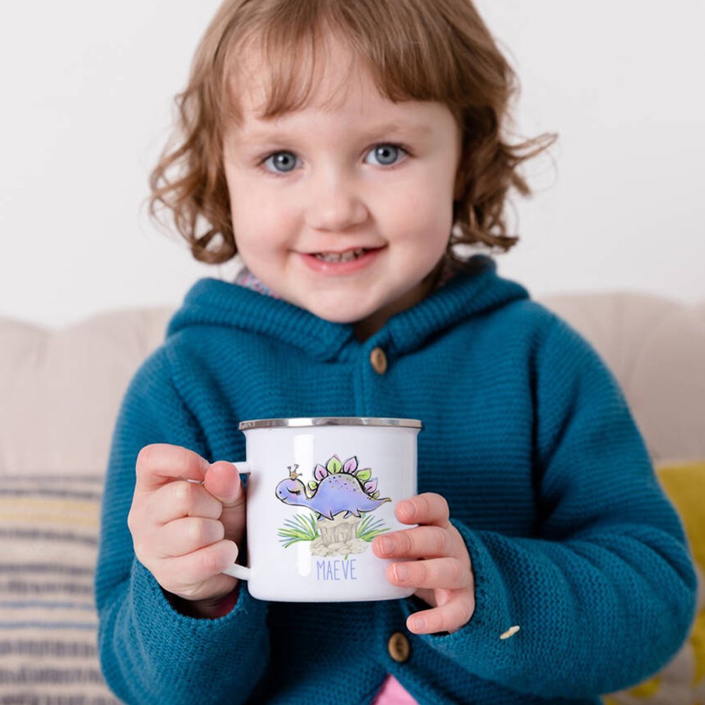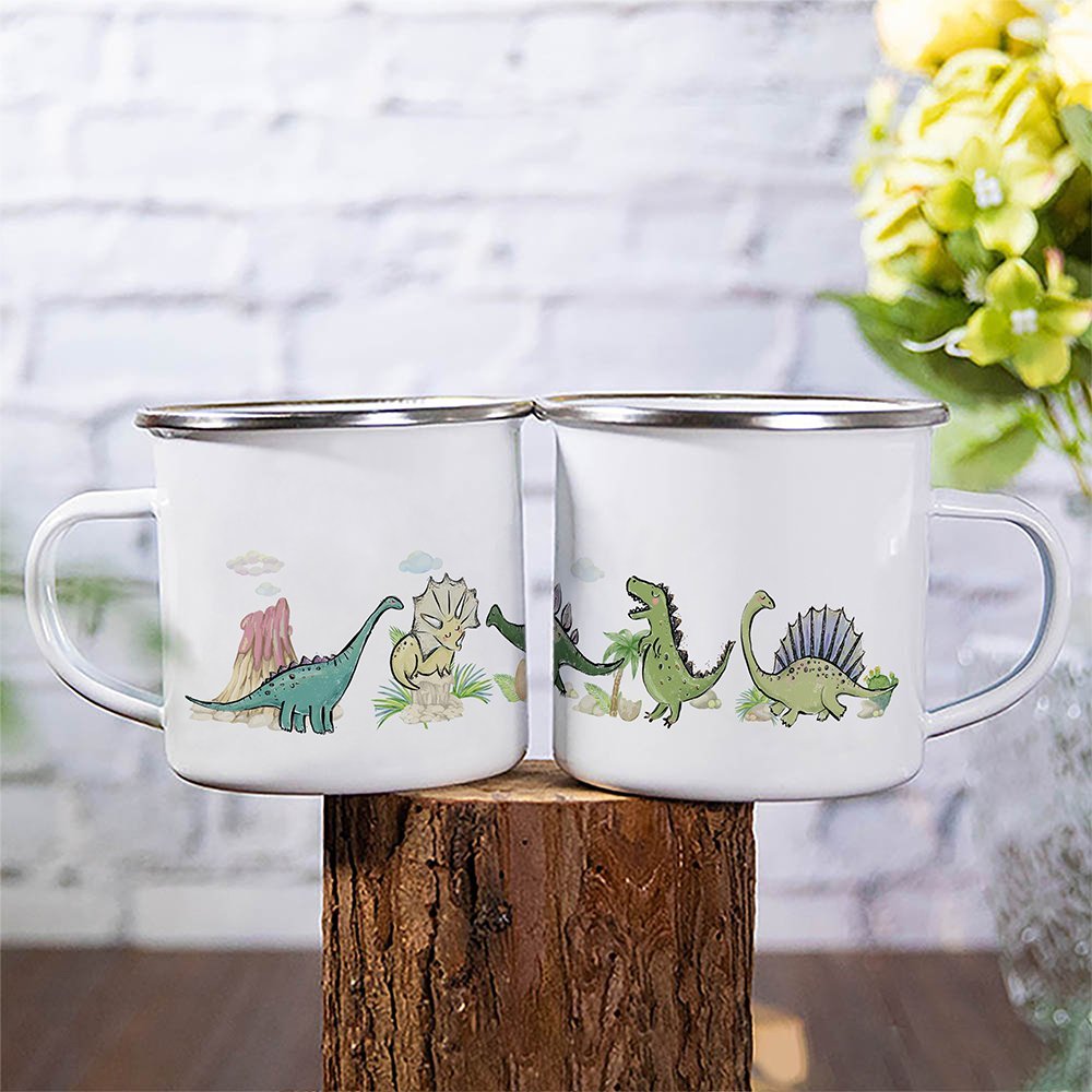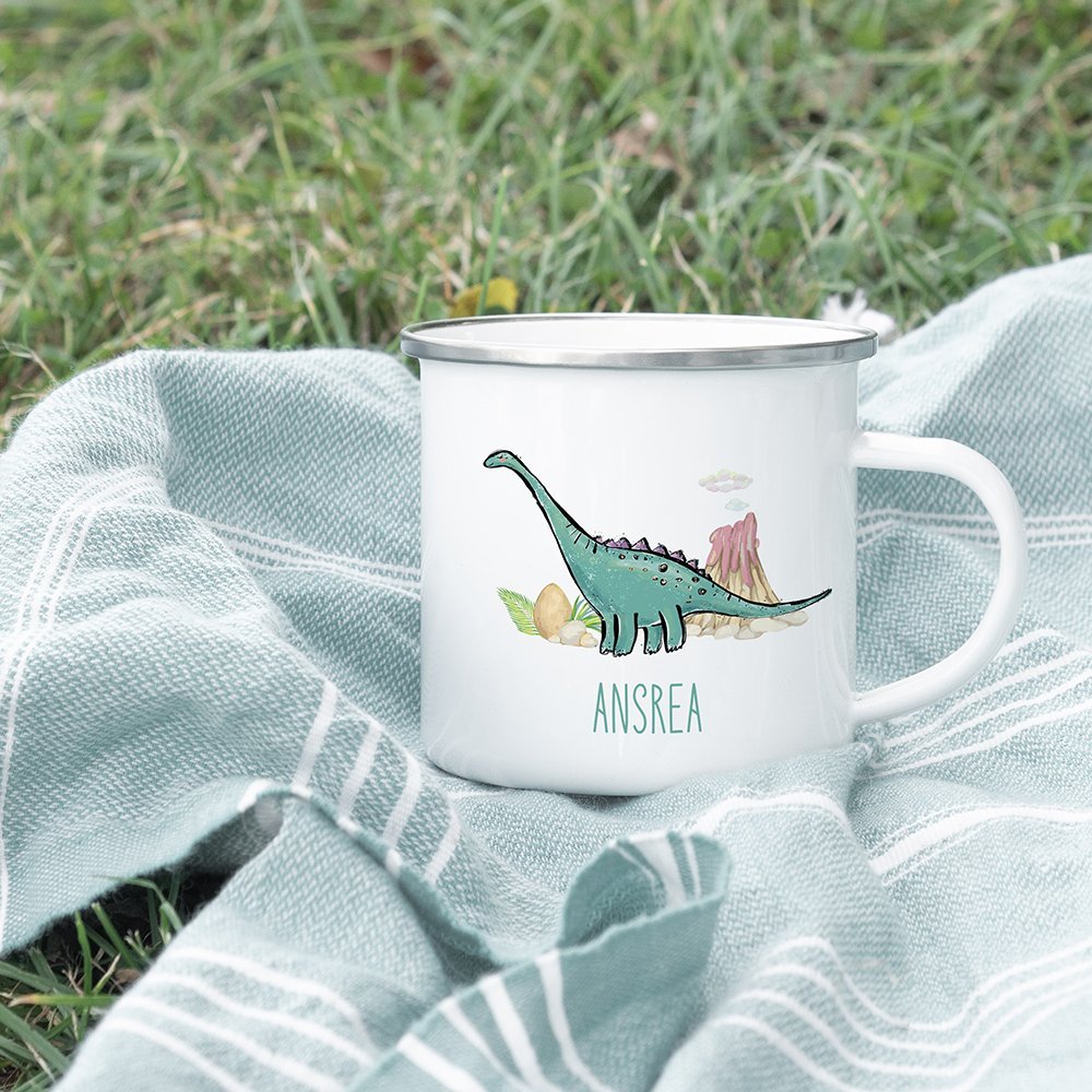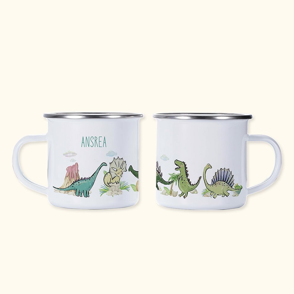 Puedes elegir entre 10 dinosaurios diferentes y personalizar con un nombre de tu elección. Estas tazas de esmalte de estilo retro con borde de plata pulida son perfectas para tomar café, zumo, cacao caliente, leche, té o limonada en esta bonita taza con tu familia a la hora del desayuno. Observa cómo los simpáticos animalitos salen de la taza y te sonríen. Te hará feliz durante todo el día.