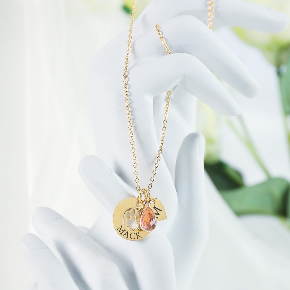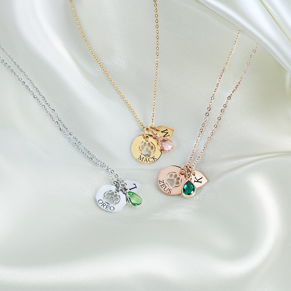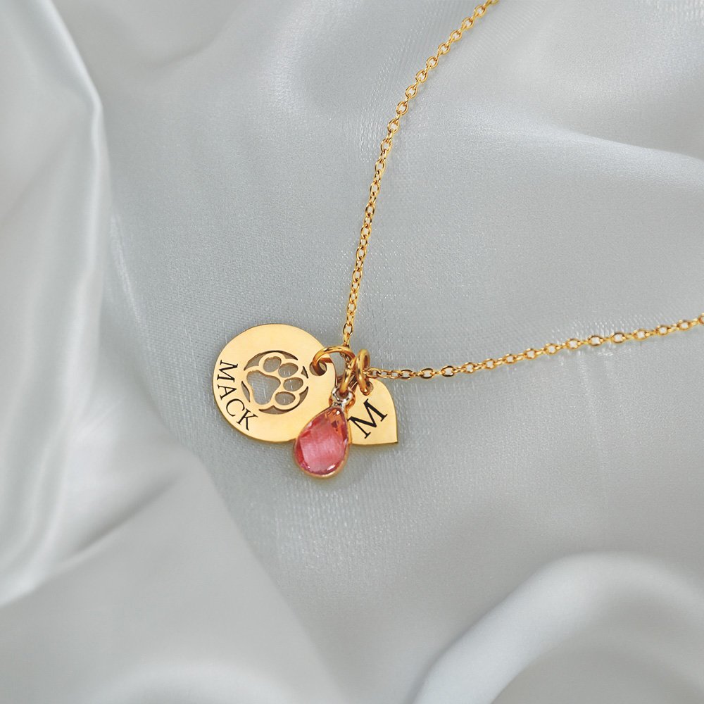 Este collar ofrece múltiples opciones de personalización, con una delicada huella de pata de perro, un corazón y una piedra de nacimiento en forma de lágrima. Añade iniciales y nombres grabados para hacerlo realmente personal. Con la posibilidad de personalizar varios corazones, este collar celebra recuerdos preciados y seres queridos con estilo y significado.