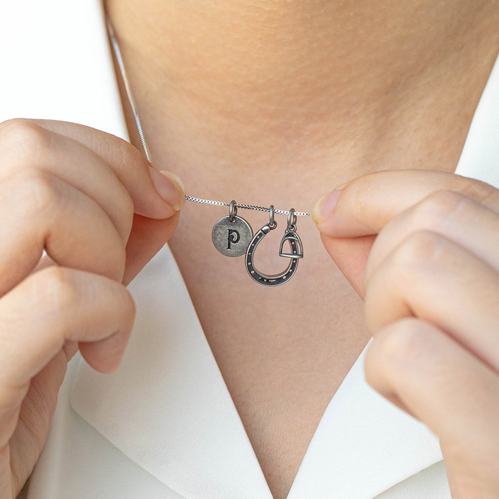Este collar presenta un impresionante diseño de inspiración ecuestre. El colgante central es una hermosa combinación de herradura y estribo. La herradura es un símbolo clásico de buena suerte, mientras que el estribo añade un toque auténtico al mundo ecuestre. Los intrincados detalles de la forma de la herradura y la estructura del estribo hacen que esta pieza destaque.