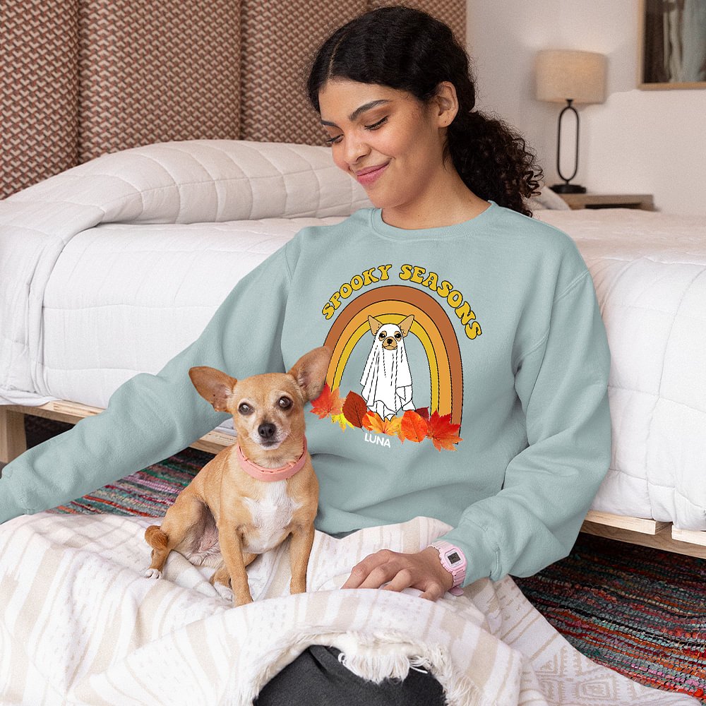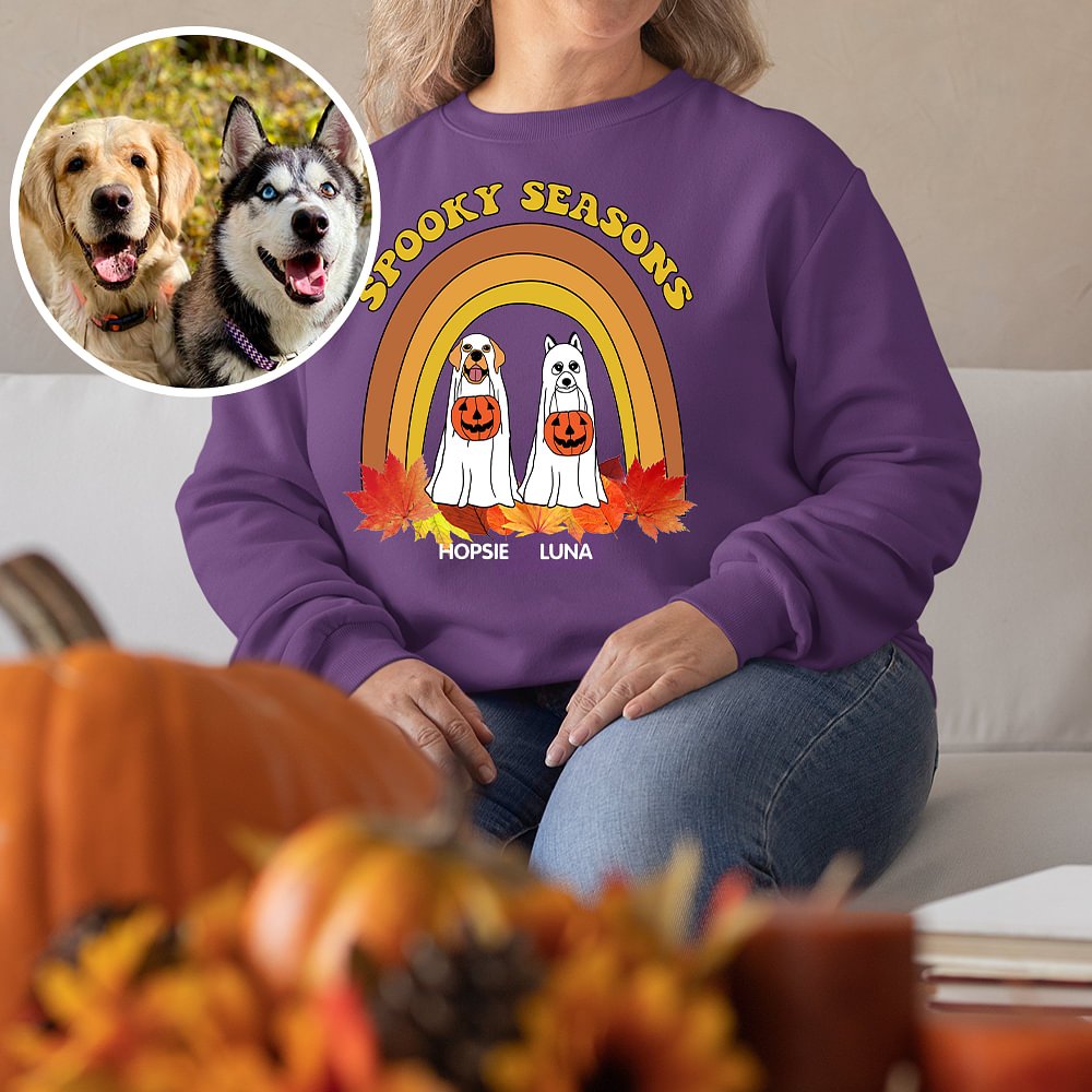 La sudadera fantasma perro personalizada de Halloween es el regalo perfecto para los amantes de los perros y los miembros de la familia. Se puede personalizar con hasta cuatro razas y nombres de perros fantasma diferentes, lo que le permite crear una pieza de moda espeluznante verdaderamente única.