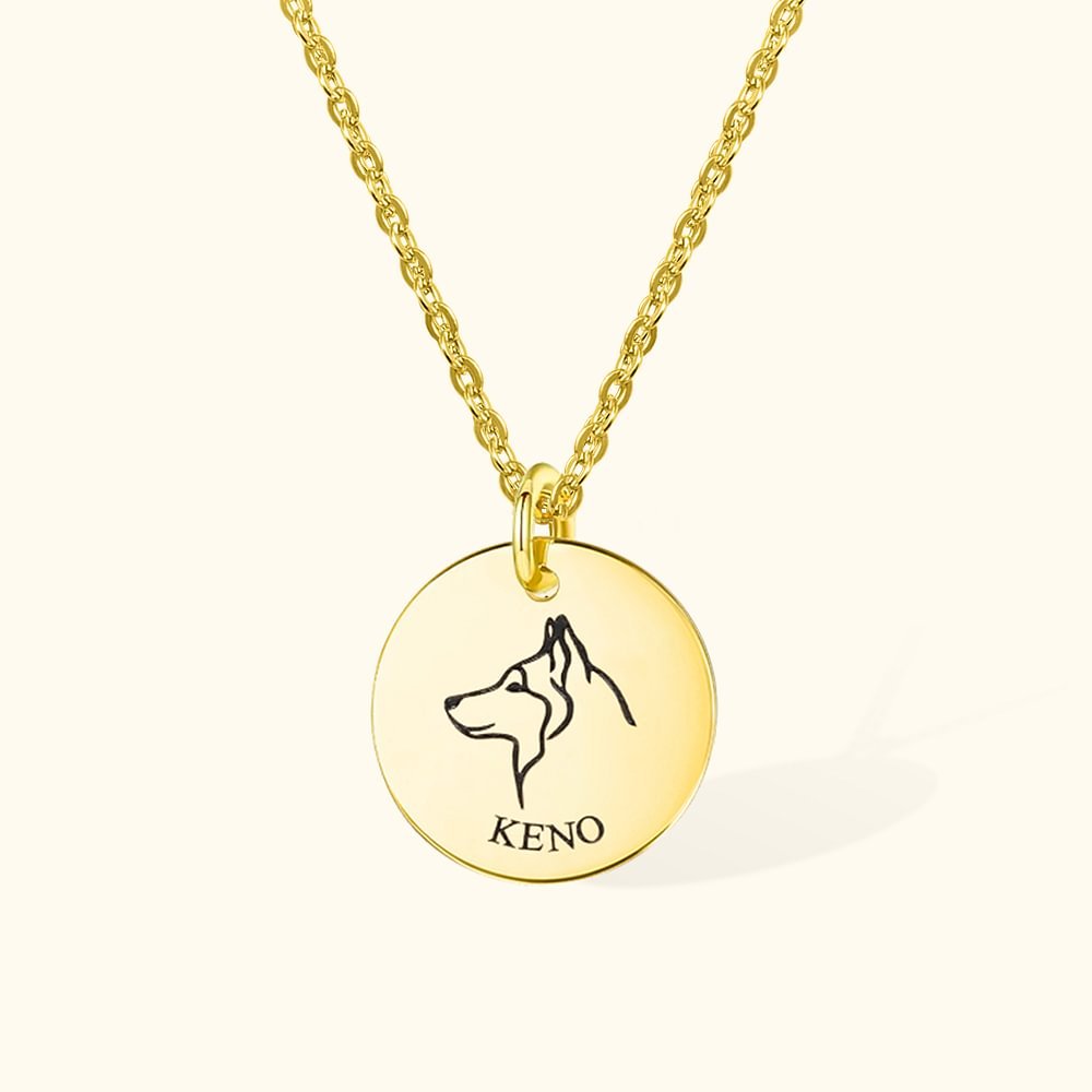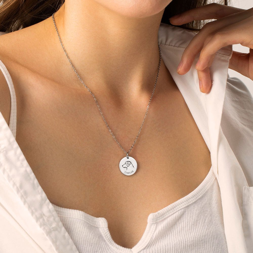 Este es un collar conmemorativo con nombre de perro. Usted puede elegir el patrón de retrato del perro de 20 tipos y personalizar el nombre del perro. Es simple y exquisito, que es muy adecuado para el desgaste diario.