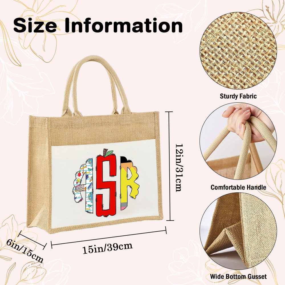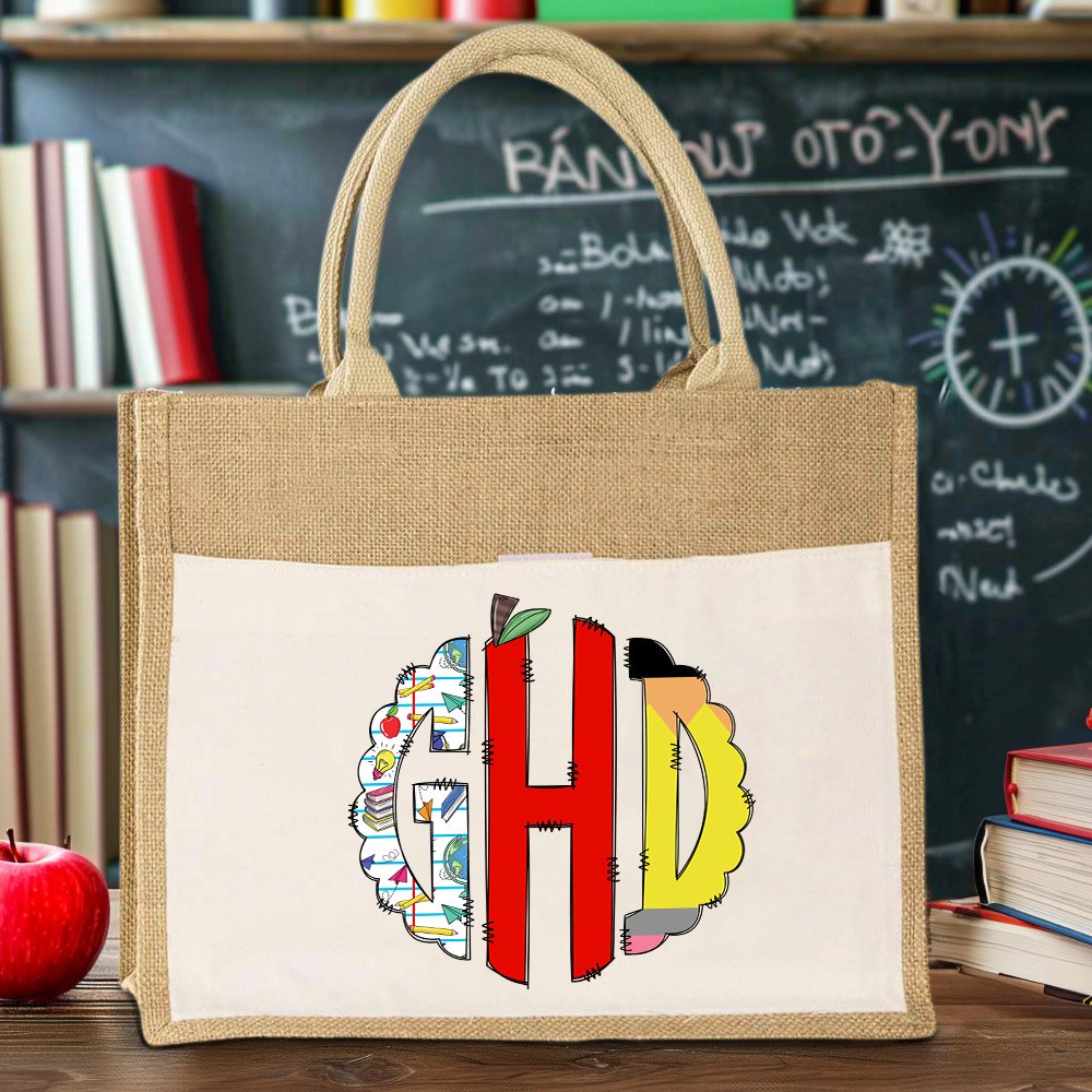 Nuestro bolso de mano personalizado presenta un cautivador diseño de monograma de garabato con elementos de cuaderno, manzana y lápiz. Personaliza la bolsa con 3 letras de tu elección para crear un accesorio único que muestre la personalidad única del profesor y su amor por su profesión.