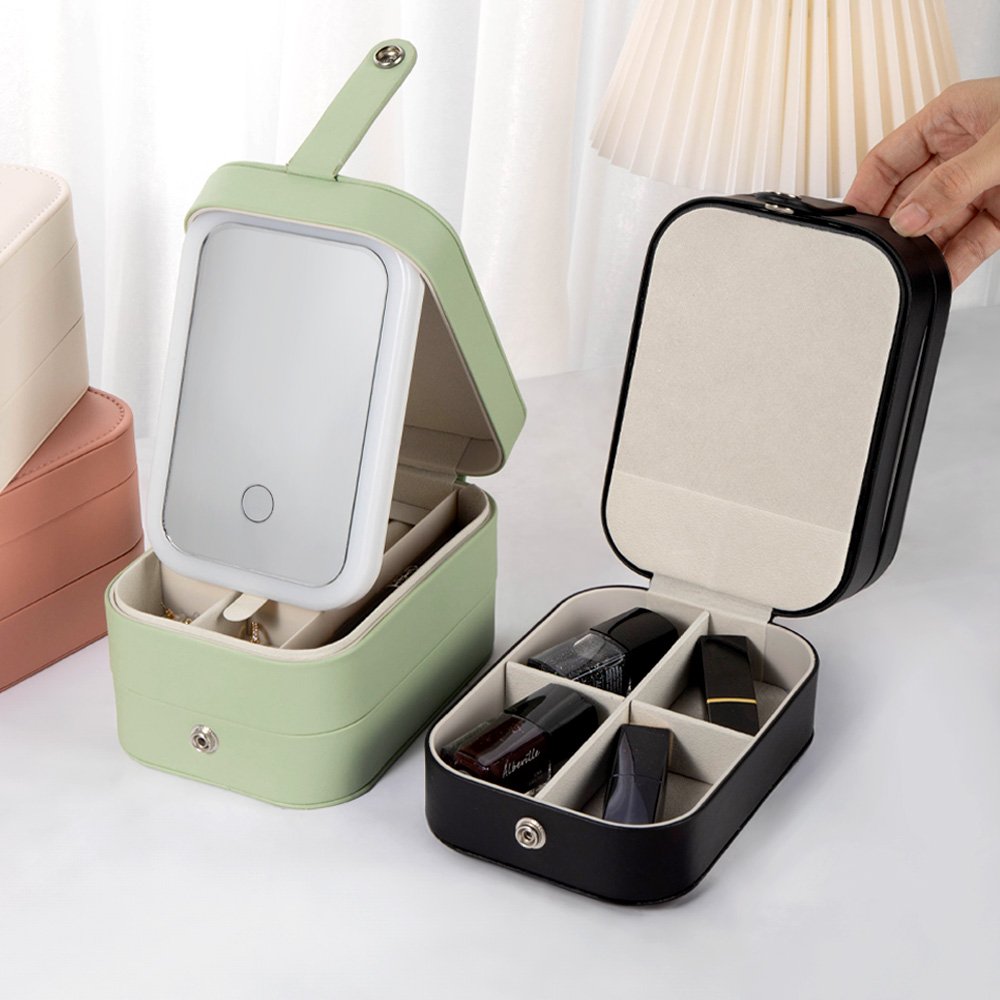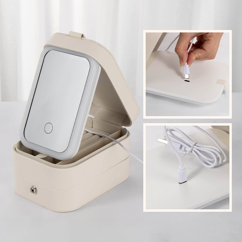 El uso de material de cuero PU de alta calidad para garantizar la durabilidad y practicidad del joyero. Su diseño único de dos capas le proporciona una solución de almacenamiento práctico. La capa superior está diseñada para la joyería, la combinación perfecta de espejos y luces LED, La capa superior está diseñada para la joyería, la combinación perfecta de espejos y luces LED, 3 colores diferentes de luz, para que cada pieza de joyería puede brillar su encanto único en la mejor luz. El nivel inferior está cuidadosamente planificado como zona de cosméticos, con cuatro divisiones diseñadas para una separación clara y un acceso fácil.