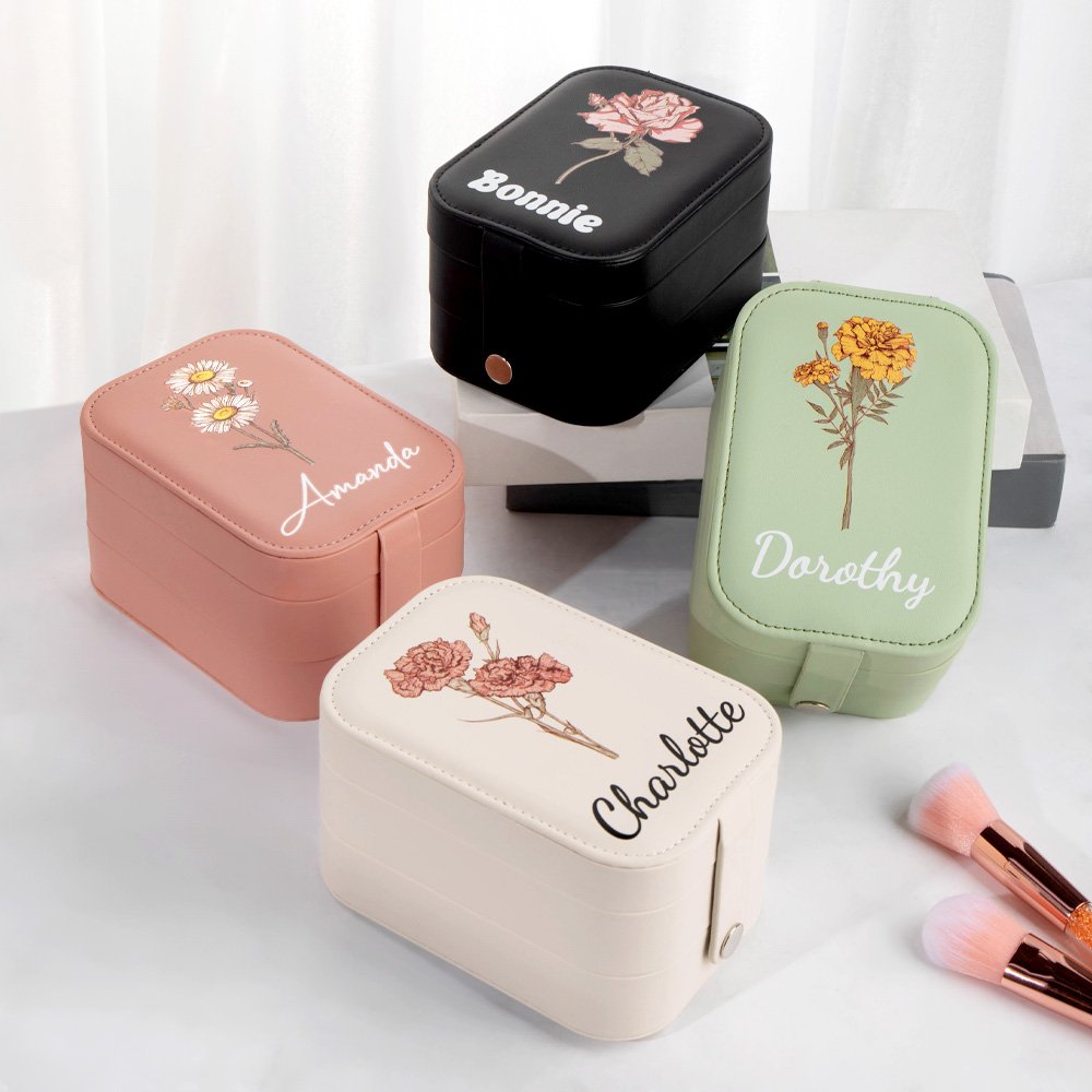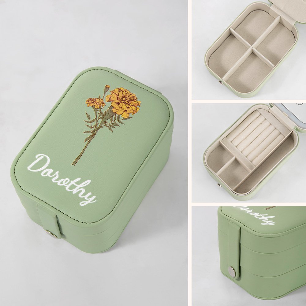 Este joyero combina hábilmente conceptos de diseño prácticos y bellos, su parte frontal se puede personalizar con flores de nacimiento y nombres, y tres opciones de letra para satisfacer sus necesidades individuales, lo que convierte a este joyero en una obra de arte única.