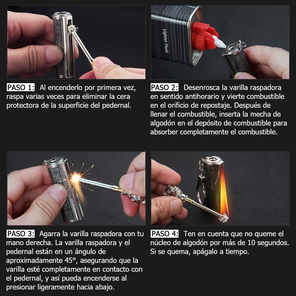 Antes de utilizar el encendedor, es necesario añadir una pequeña cantidad de combustible (gasolina o queroseno) y dejar que el palo de cerilla se inyecte durante 1-2 minutos (el núcleo de algodón absorbe completamente el combustible).