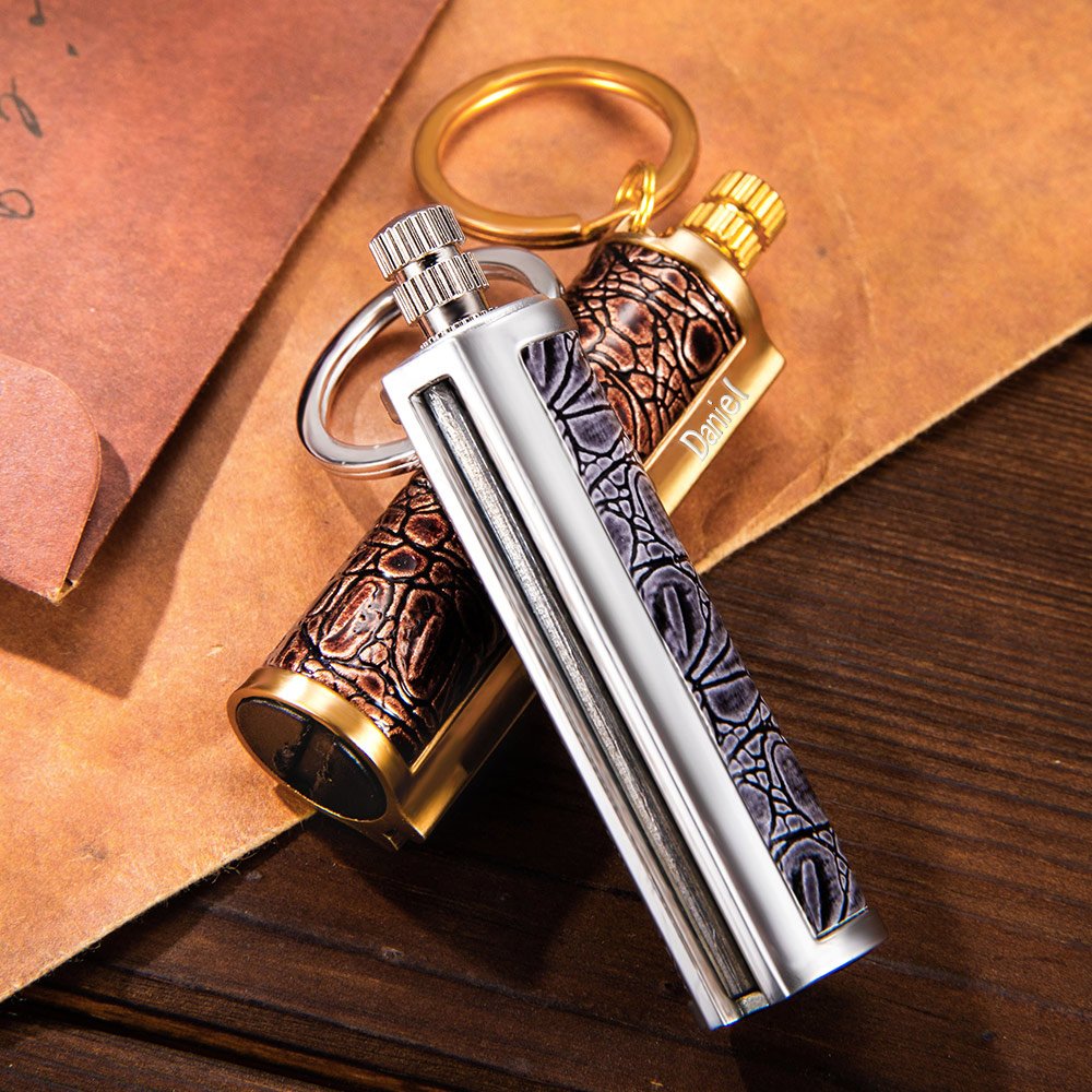Estos llaveros encendedores de metal están hechos de aleación de zinc, que puede ser rellenado y encendido por lo menos 10,000 veces, a prueba de caídas, impermeable y resistente al viento, durable de usar, y adecuado para el hogar, montañismo, senderismo, y otras actividades al aire libre.