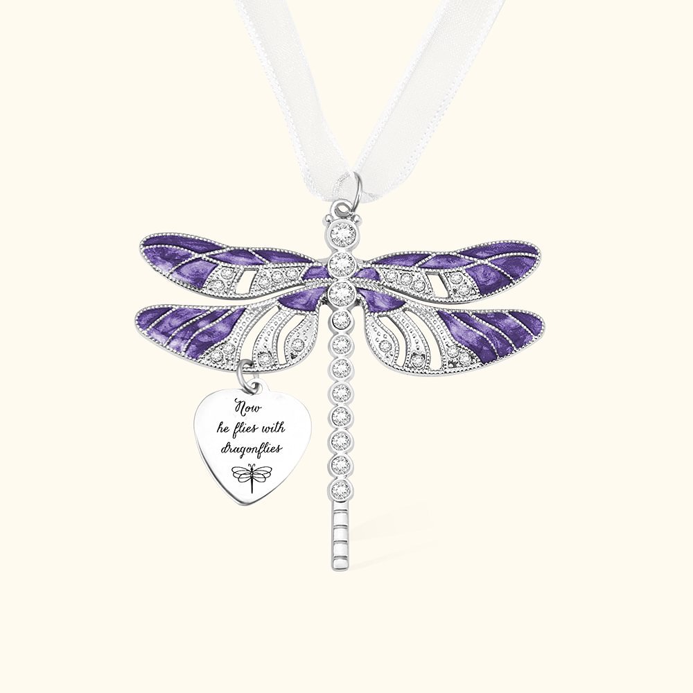 Ahora vuela con libélulas ornamento conmemorativo. Qué inspirador. Muy significativo. Por fin es libre. Usted puede agregar texto al encanto. Una hermosa libélula para colgar en una ventana, pared, Árbol de Navidad, espejo retrovisor, o donde quieras.