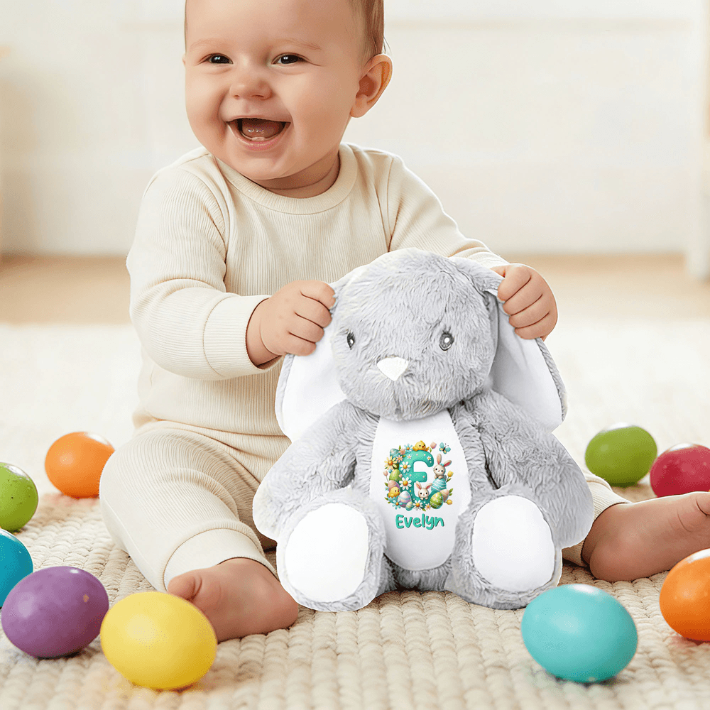 Centrado en el tema de la Pascua, este peluche puede personalizarse con una inicial y está adornado con elementos festivos como adorables conejitos de dibujos animados, pollitos, huevos de Pascua y florecitas frescas, todo rebosante de encanto y alegría infantiles. Con sus orejas largas y suaves, su cuerpo redondo y esponjoso y su nombre personalizado, conserva el reconfortante atractivo de un peluche clásico a la vez que irradia el alegre espíritu de la Pascua. Cada juguete se convierte en un compañero de vacaciones único, hecho especialmente para un niño.