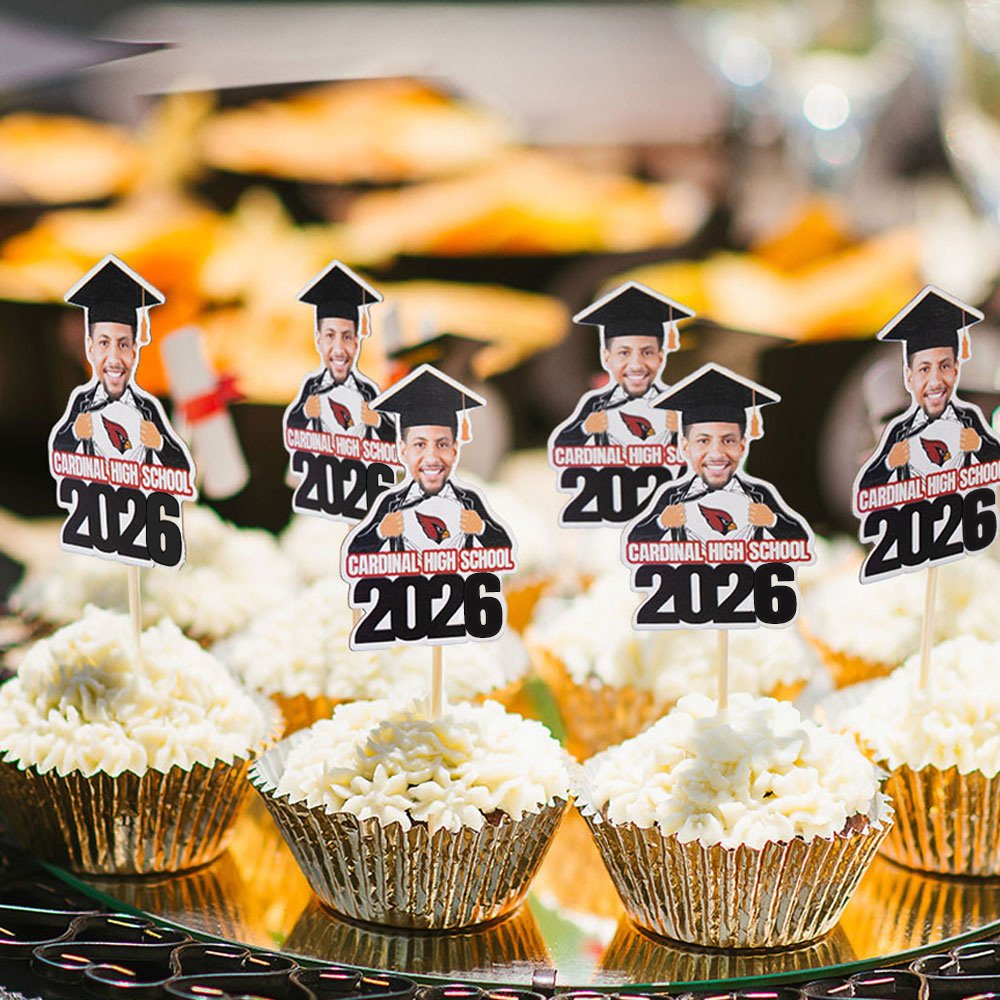Añade un toque divertido y personalizado a los postres de tu fiesta de graduación con estos extravagantes cupcakes con foto de cara. Además de la foto de tu cara, también puedes personalizarlos con el nombre de tu colegio y un mensaje especial, para que sean realmente únicos en tu celebración.