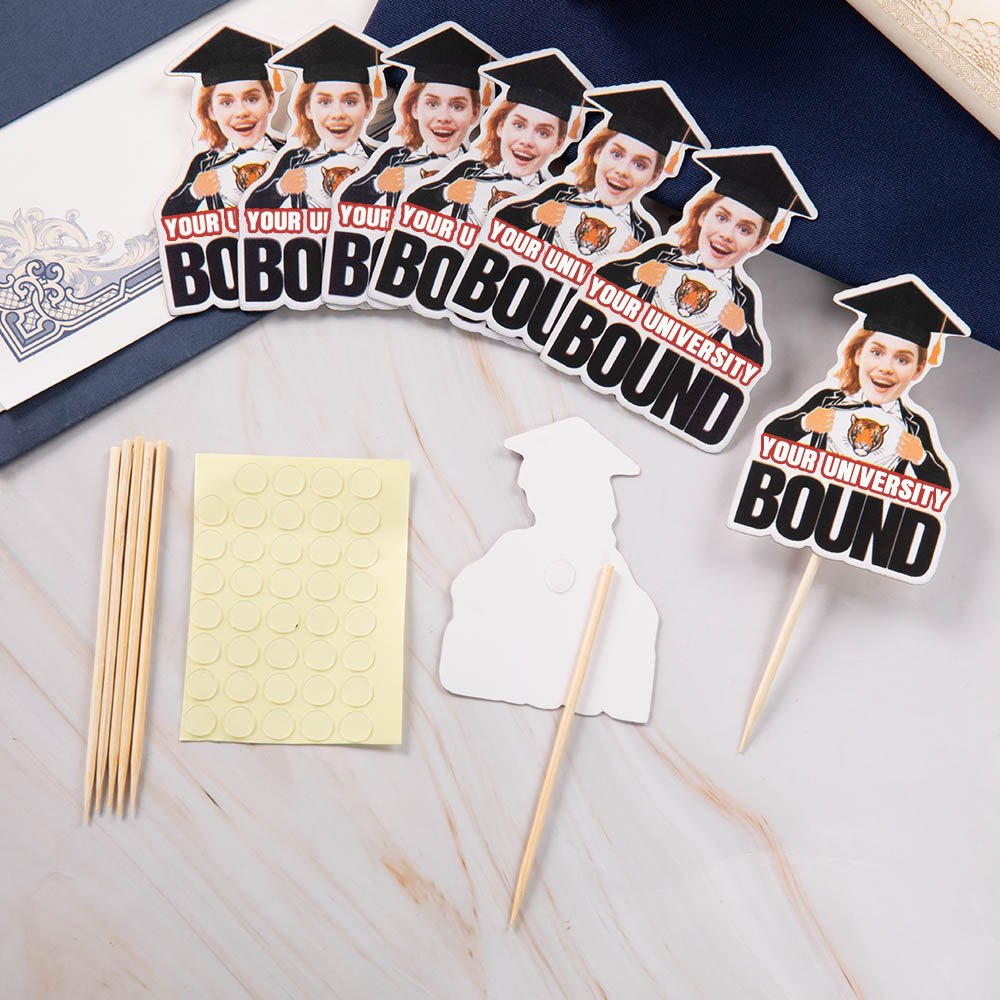 Añade un toque divertido y personalizado a los postres de tu fiesta de graduación con estos extravagantes cupcakes con foto de cara. Además de la foto de tu cara, también puedes personalizarlos con el nombre de tu colegio y un mensaje especial, para que sean realmente únicos en tu celebración.