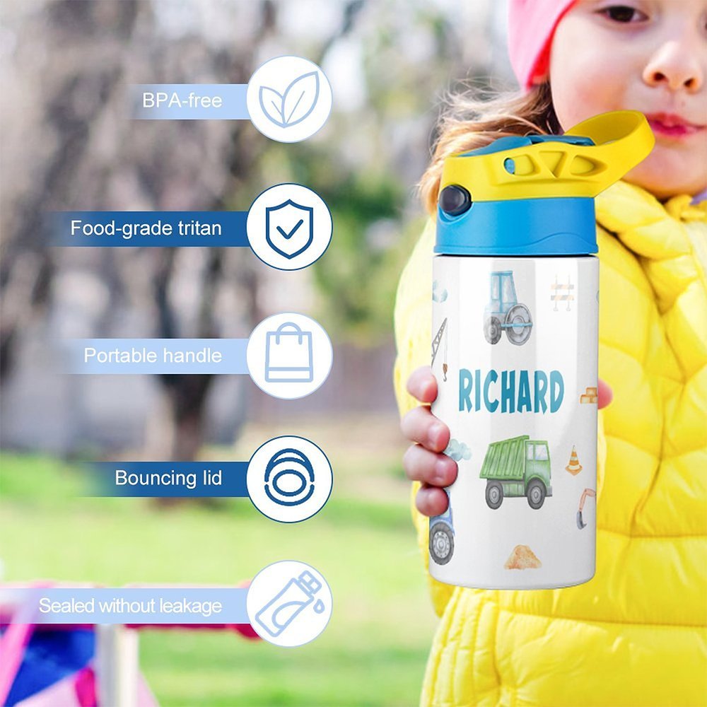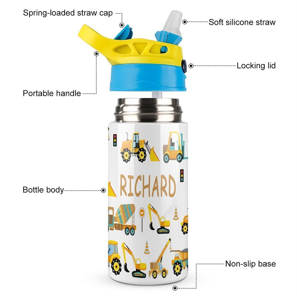 La botella de agua tiene dos estilos, uno con dibujos de dinosaurios. La otra tiene dibujos de vehículos de ingeniería. Varios patrones pueden ayudar a los niños a entender mejor los tipos de vehículos de ingeniería y dinosaurios.