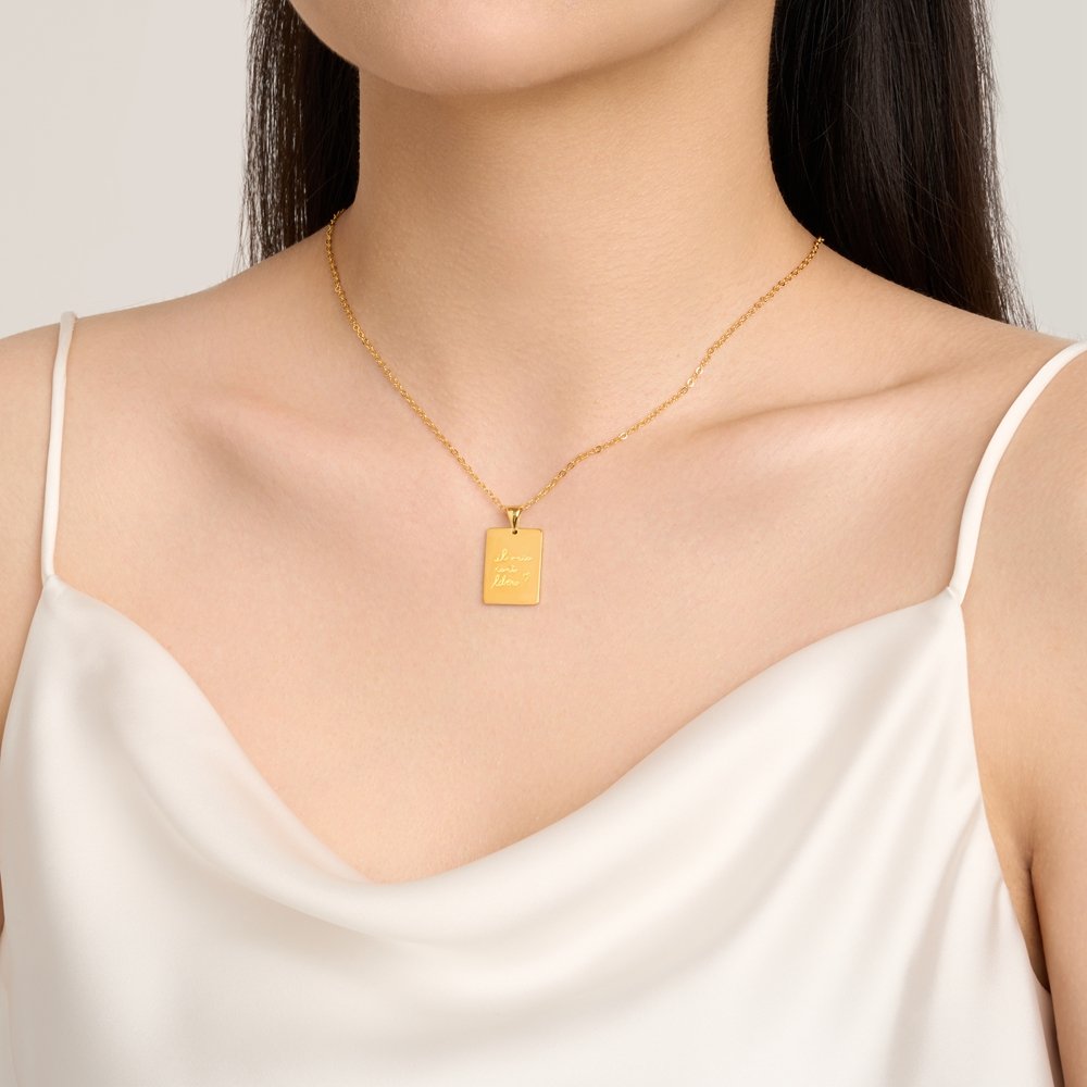 Nuestro collar con escritura grabada está cuidadosamente diseñado para capturar cada detalle de la escritura de tu ser querido. Al enviarnos una imagen clara de su letra, transformaremos ese recuerdo en un hermoso colgante que servirá como un recordatorio constante de tu amor y cariño.