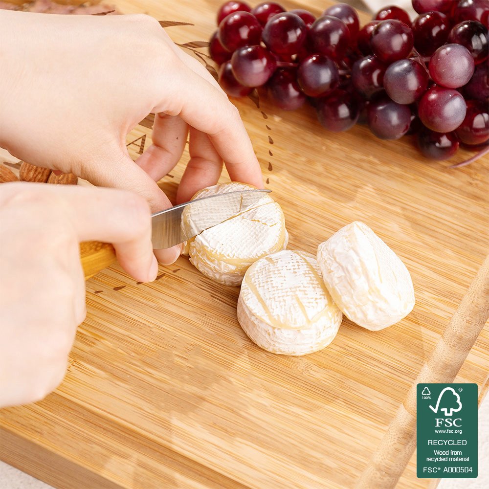 Fabricada con materiales de bambú de primera calidad con certificación FSC, la tabla de cortar no sólo es respetuosa con el medio ambiente, sino que también tiene propiedades antibacterianas naturales. La exquisita artesanía hace que esta tabla de cortar sea extremadamente duradera y resistente. Cada detalle se pule cuidadosamente para garantizar que quede muy lisa y plana, sin rebabas, grietas, astillas, etc.