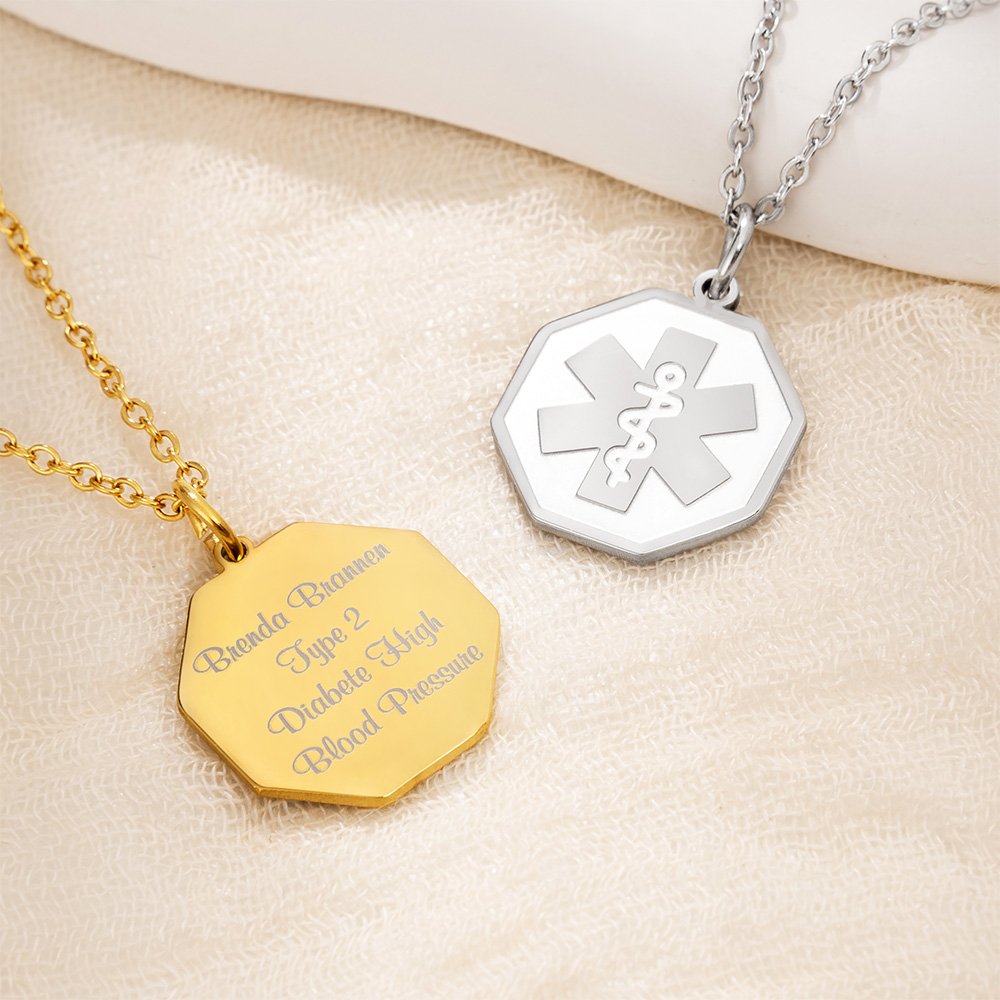 La elegante y bonita pulsera médica personalizada está diseñada para proporcionar información médica importante en caso de emergencia. Puede elegir un motivo para el collar (por ejemplo, Estrella de la vida, Caduceo) y añadir la información médica necesaria, como alergias, como Alergia, Diabetes de tipo 1, Diabetes de tipo 2, Epilepsia, Alzheimer, y datos de contacto en caso de emergencia. En caso de una situación médica inesperada, este discreto collar puede ser un salvavidas, ya que garantiza que la información vital esté fácilmente disponible para los primeros intervinientes.