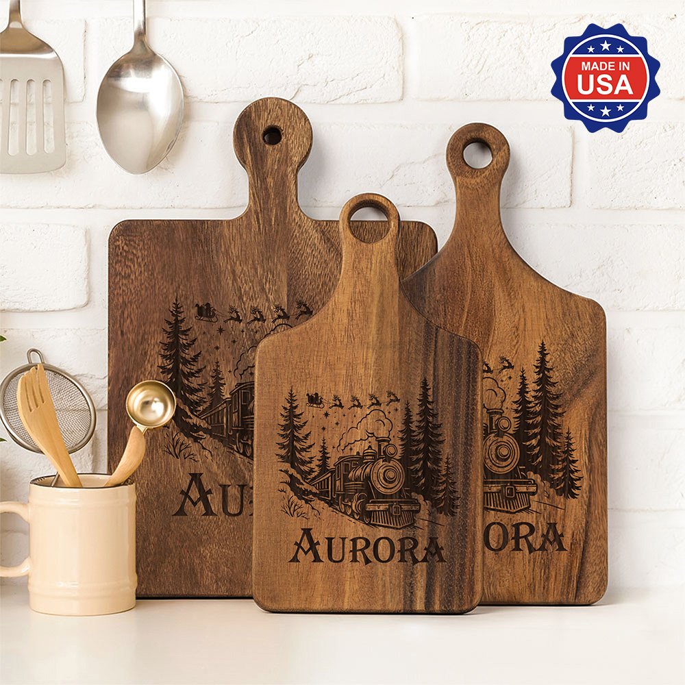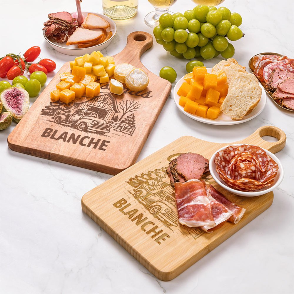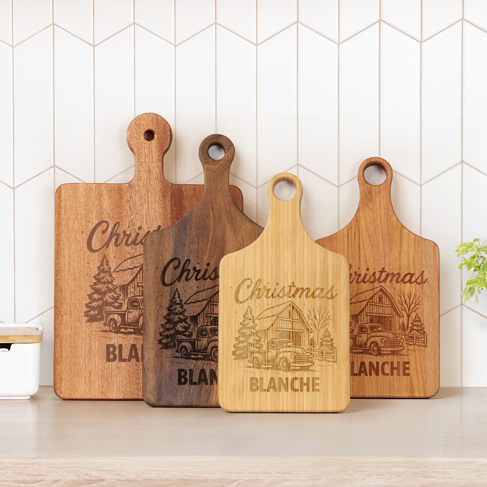 Esta tabla de cortar presenta un diseño grabado personalizado: puedes añadir un nombre combinado con motivos festivos como un camión vintage, un granero y árboles de Navidad bajo un titular "Navidad".